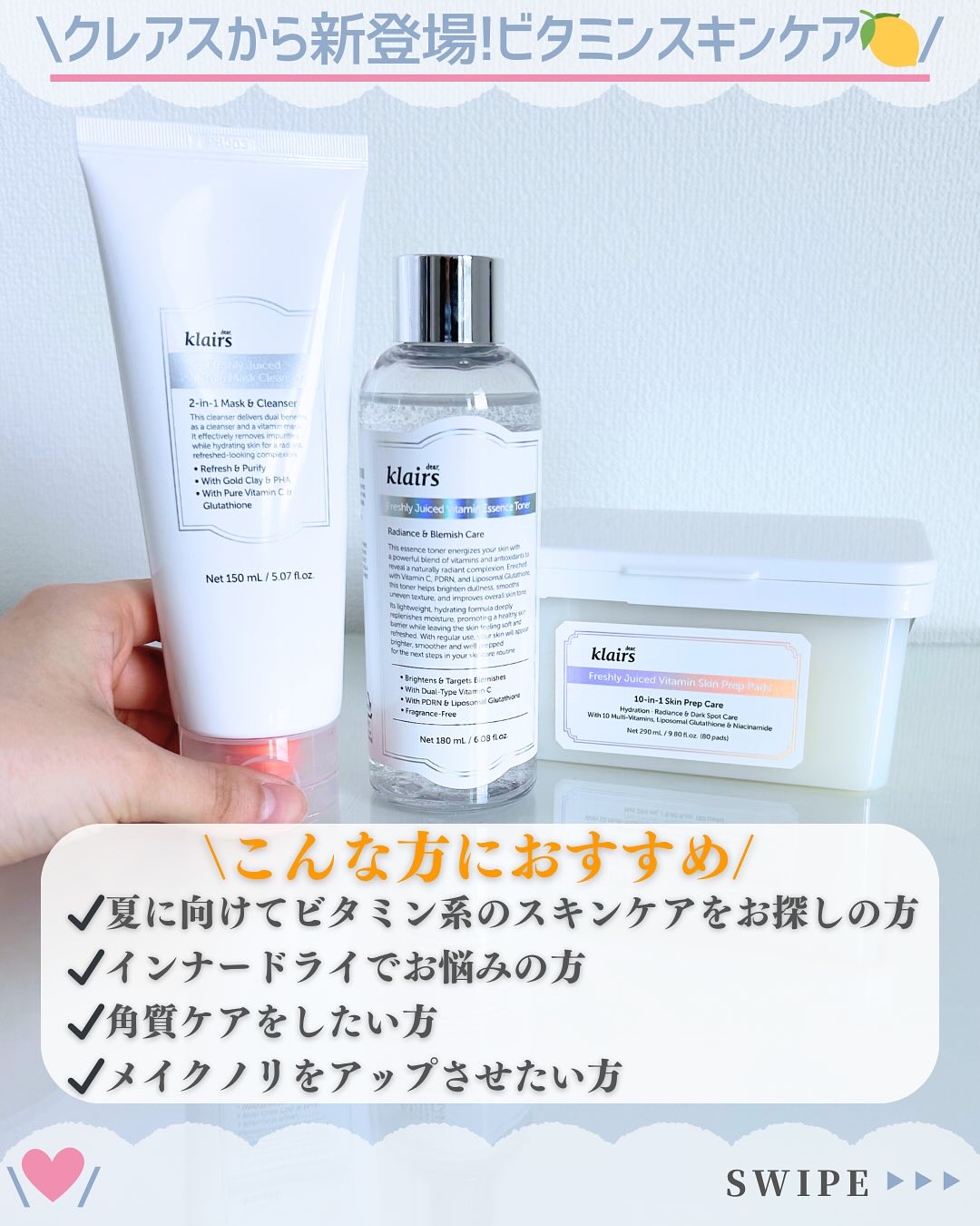 _KlairsFreshlyJuicedVitaminMaskCleanserクレアスヒアルビタグルパッククレンザー150g/¥1,611(Qoo10公式より)FreshlyJuicedVitaminSkinPrepPadsビタグル10マスク...