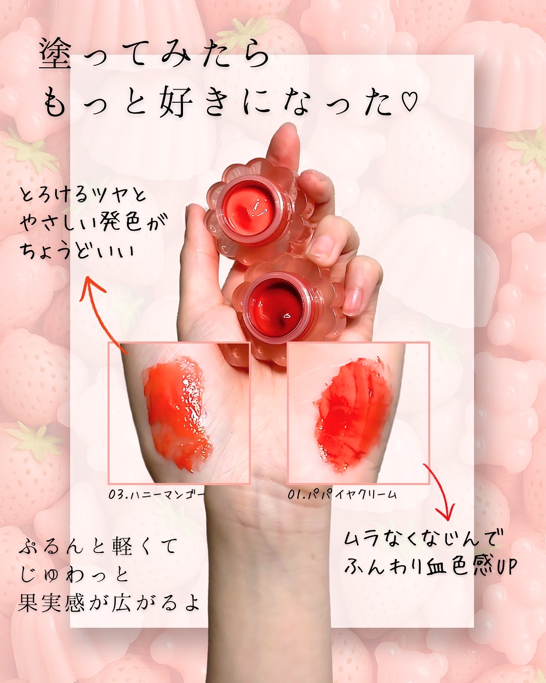 - <01 パパイヤクリーム> 水、ヘキサ(ヒドロキシステアリン酸/ステアリン酸/ロジン酸)ジペンタエリスリチル、トリエチルヘキサノイン、BG、グリセリン、オクチルドデカノール、ポリソルベート60、プロパンジオール、(PEG-240/デシルテトラデセス-20/HDI)コポリマー、1,2-ヘキサンジオール、セテアレス-20、フェノキシエタノール、エチルセルロース、カプリル酸グリセリル、(アクリル酸ヒドロキシエチル/アクリロイルジメチルタウリンNa)コポリマー、トリイソステアリン酸ポリグリセリル-2、リンゴ酸ジイソステアリル、酸化チタン、スクワラン、(アクリレーツ/アクリル酸アルキル(C10-30))クロスポリマー、トロメタミン、香料、エチルヘキシルグリセリン、黄4、赤104(1)、黄5、赤227、エチレンジアミンジコハク酸3Na、イソステアリン酸ソルビタン、ジイソステアリン酸ポリグリセリル-2、リナロール、ラウリン酸K、トコフェロール、青1 <02 ピーチドロップ> 水、ヘキサ(ヒドロキシステアリン酸/ステアリン酸/ロジン酸)ジペンタエリスリチル、トリエチルヘキサノイン、BG、グリセリン、オクチルドデカノール、ポリソルベート60、プロパンジオール、(PEG-240/デシルテトラデセス-20/HDI)コポリマー、1,2-ヘキサンジオール、セテアレス-20、フェノキシエタノール、リンゴ酸ジイソステアリル、酸化チタン、エチルセルロース、カプリル酸グリセリル、(アクリル酸ヒドロキシエチル/アクリロイルジメチルタウリンNa)コポリマー、トリイソステアリン酸ポリグリセリル-2、スクワラン、(アクリレーツ/アクリル酸アルキル(C10-30))クロスポリマー、トロメタミン、香料、エチルヘキシルグリセリン、黄5、赤104(1)、赤227、黄4、エチレンジアミンジコハク酸3Na、イソステアリン酸ソルビタン、ジイソステアリン酸ポリグリセリル-2、青1、リナロール、ラウリン酸K、トコフェロール <03 ハニーマンゴ> 水、ヘキサ(ヒドロキシステアリン酸/ステアリン酸/ロジン酸)ジペンタエリスリチル、トリエチルヘキサノイン、BG、グリセリン、オクチドデカノール、ポリソルベート60、プロパンジオール、(PEG-240/デシルテトラデセス-20/HDI)コポリマー、1,2-ヘキサンジオール、セテアレス-20、フェノキシエタノール、エチルセルロース、リンゴ酸ジイソステアリル、カプリル酸グリセリル、酸化チタン、(アクリル酸ヒドロキシエチル/アクリロイルジメチルタウリンNa)コポリマー、トリイソステアリン酸ポリグリセリル-2、スクワラン、(アクリレーツ/アクリル酸アルキル(C10-30))クロスポリマー、トロメタミン、香料、エチルヘキシルグリセリン、赤104(1)、黄5、赤227、黄4、エチレンジアミンジコハク酸3Na、イソステアリン酸ソルビタン、ジイソステアリン酸ポリグリセリル-2、リナロール、ラウリン酸K、トコフェロール、青1 <04 ピンクバブル> 水、ヘキサ(ヒドロキシステアリン酸/ステアリン酸/ロジン酸)ジペンタエリスリチル、トリエチルヘキサノイン、BG、グリセリン、オクチドデカノール、ポリソルベート60、プロパンジオール、(PEG-240/デシルテトラデセス-20/HDI)コポリマー、1,2-ヘキサンジオール、セテアレス-20、フェノキシエタノール、エチルセルロース、カプリル酸グリセリル、トリイソステアリン酸ポリグリセリル-2、(アクリル酸ヒドロキシエチル/アクリロイルジメチルタウリンNa)コポリマー、スクワラン、(アクリレーツ/アクリル酸アルキル(C10-30))クロスポリマー、リンゴ酸ジイソステアリル、酸化チタン、トロメタミン、香料、エチルヘキシルグリセリン、赤104(1)、酸化鉄、赤227、エチレンジアミンジコハク酸3Na、ジイソステアリン酸ポリグリセリル-2、黄4、イソステアリン酸ソルビタン、黄5、リナロール、ラウリン酸K、トコフェロール <05 アップルゼリー> 水、ヘキサ(ヒドロキシステアリン酸/ステアリン酸/ロジン酸)ジペンタエリスリチル、トリエチルヘキサノイン、BG、グリセリン、オクチドデカノール、ポリソルベート60、プロパンジオール、(PEG-240/デシルテトラデセス-20/HDI)コポリマー、1,2-ヘキサンジオール、セテアレス-20、フェノキシエタノール、トリイソステアリン酸ポリグリセリル-2、エチルセルロース、カプリル酸グリセリル、(アクリル酸ヒドロキシエチル/アクリロイルジメチルタウリンNa)コポリマー、スクワラン、(アクリレーツ/アクリル酸アルキル(C10-30))クロスポリマー、トロメタミン、香料、リンゴ酸ジイソステアリル、酸化チタン、エチルヘキシルグリセリン、赤227、黄5、赤104(1)、黄4、エチレンジアミンジコハク酸3Na、ジイソステアリン酸ポリグリセリル-2、イソステアリン酸ソルビタン、リナロール、ラウリン酸K、トコフェロール、青1 <06 クアバキャンディ> 水、ヘキサ(ヒドロキシステアリン酸/ステアリン酸/ロジン酸)ジペンタエリスリチル、トリエチルヘキサノイン、BG、グリセリン、オクチドデカノール、ポリソルベート60、プロパンジオール、(PEG-240/デシルテトラデセス-20/HDI)コポリマー、1,2-ヘキサンジオール、セテアレス-20、フェノ