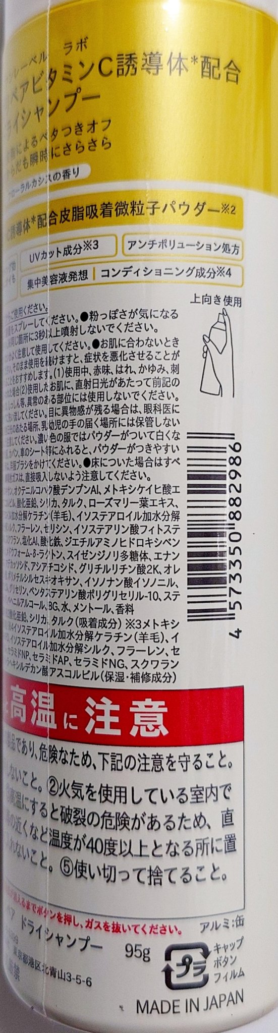 - ベタベタ・ペタンコ髪がふんわりさらさらに! 汗や皮脂でべたついた髪やニオイが気になる夏。「アンレーベルラボ V リペア ドライシャンプー」は、超高圧*¹浸透型リペアビタミンC誘導体*²を配合の皮脂吸着微粒子パウダー*³が、汗と皮脂によるベタつきをしっかりオフ。夕方のペタンコ前髪、ベタつきも瞬間*⁴さらさら快適に整えます。 *1超高圧加工処理装置を用いた原料 *2超高圧処理したテトラヘキシルデカン酸アスコルビル(保湿成分) *3酸化亜鉛、シリカ、タルク(吸着成分) *4髪、からだに塗布する時間のこと