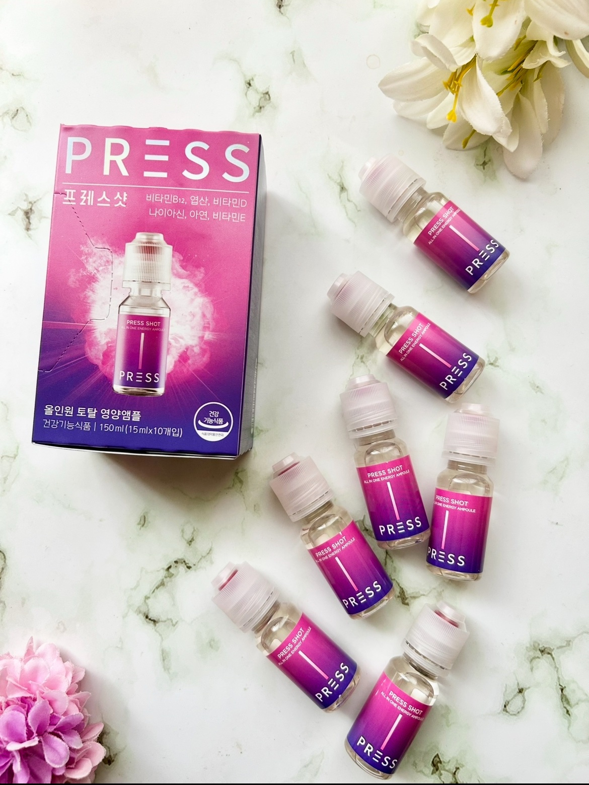 - ・PRESSしてSHAKEするだけ!魔法のようなピンクビタミンに! ・飲むインナービューティー ・飲むピンクビタミン ・粉末にはビタミン B12/D/E、葉酸、ナイアシン、亜鉛が含まれています ・吸収力を重視した液状タイプでの商品設計 ・特許取得の特殊キャップにビタミンを真空密封 ・ビタミンB群を集中配合 ・ビタミンB12は1日の基準値に対し16,667%配合 ・液体は11種類のアミノ酸で吸収しやすい設計 ・飲む瞬間にキャップを押す⇒ビタミンが液体に混ざりフレッシュなビタミンドリンクが完成! 【注意事項】 ・高カルシウム血症がある場合、または医薬品を服用されている方は専門家に相談してください。 ・体に異変を感じた場合は使用を中止し、速やかに専門家に相談してください。 ●本品は、多量摂取により疾病が治癒したり、より健康が増進するものではありません。 亜鉛の摂り過ぎは、銅の吸収を阻害するおそれがありますので、過剰摂取にならないよう注意してください。一日の摂取目安量を守ってください。乳幼児・小児は本品の摂取を避けてください。 ●本品は、特定保健用食品と異なり、消費者庁長官による個別審査を受けたものではありません。 ●食生活は、主食、主菜、副菜を基本に、食事のバランスを。 ●本品製造工場では卵、小麦、そば、落花生、えび、かに、くるみを含む製品を製造しています。 ●摂取目安量:1日当たり1本を目安にお飲みください。 ●摂取の方法:キャップを押すと粉末が落ちます。上下に振り、混ぜてからお飲みください。※粉末が固まる場合がございますが、品質には問題ありません。よく振ってからお飲みください。 2024年12月中旬より全国のウエルシア薬局とロフト※にて先行販売をいたします。 ※一部お取り扱いがない店舗がございます。