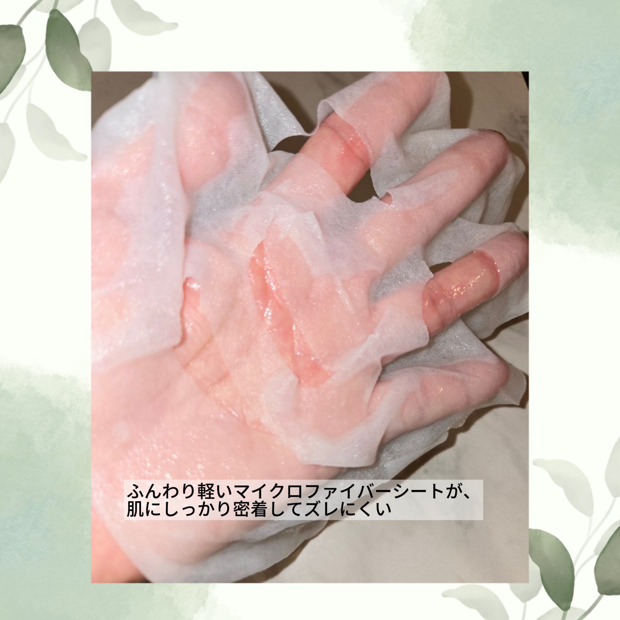 | シワも出来ずにぴたーっと密着。顔との一体感がすごい!そして液がヒタヒタなのに垂れてこない! | 詳細を見る | ||