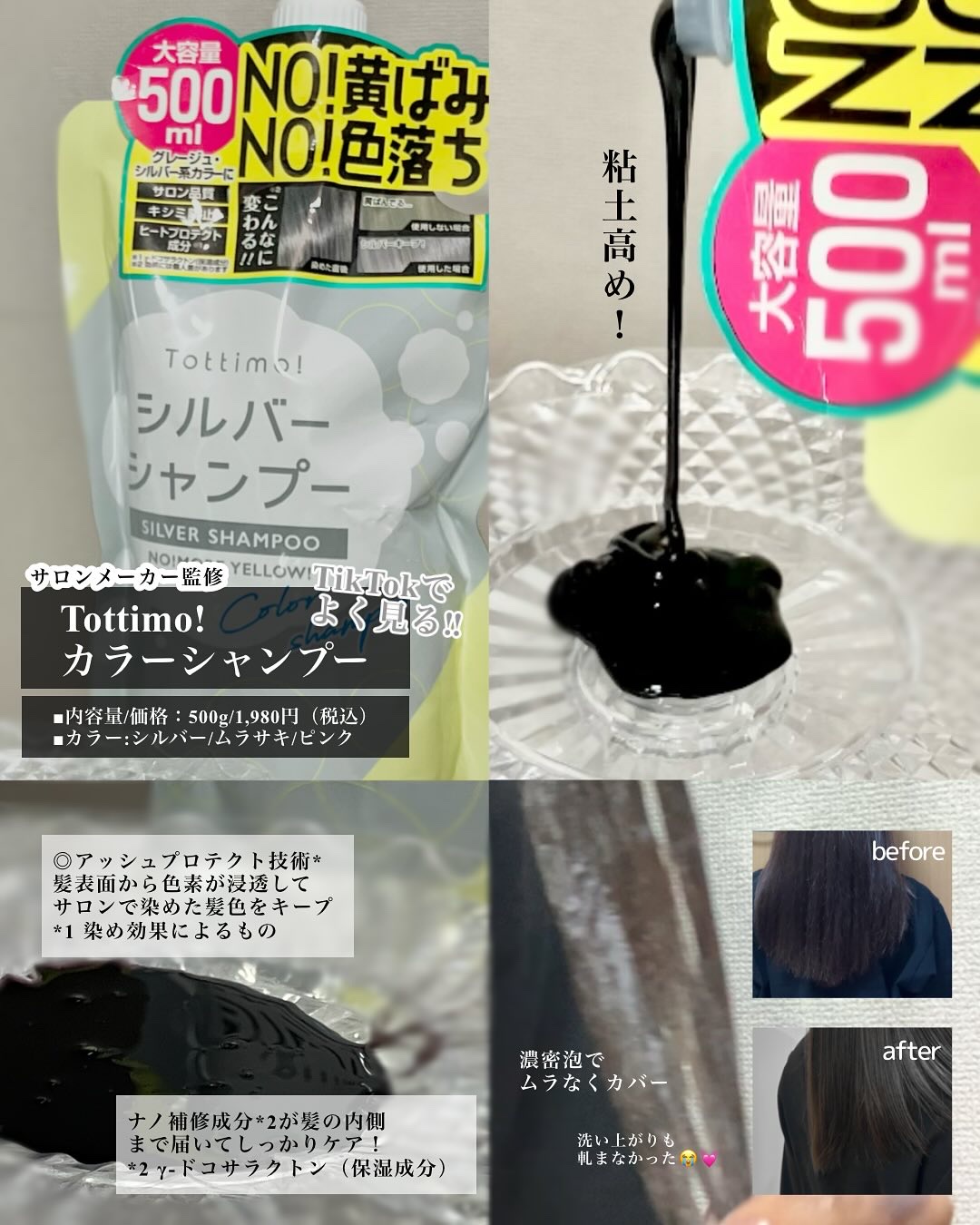 高コスパ◎サロンで染めた髪色をキープ!グレージュ・シルバー系カラーに🩶****Tottimo!カラーシャンプーシルバーシャンプー****サロンメーカー監修のTikTokでバズってるTottimo!のカラーシャンプー使ってみたよ𖤐´-500ml...