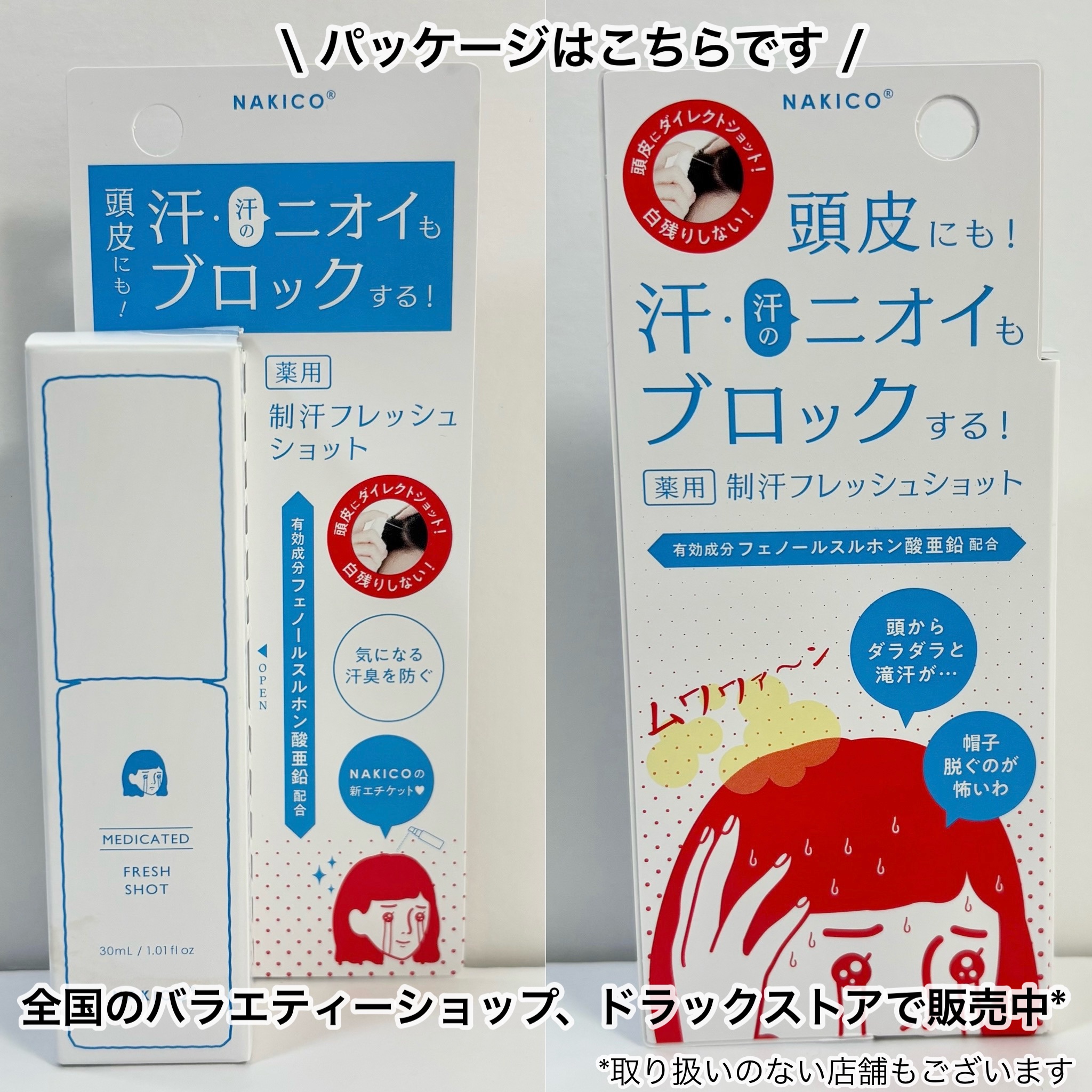 - 【医薬部外品】 日常の生活シーンでの気になる頭まわりのニオイや汗問題に着目。NAKICOの新作「薬用制汗フレッシュショット」はフェノールスルホン酸亜鉛とイソプロピルメチルフェノールのW主剤*配合の制汗ミストです。直接肌に届きやすいダイレクトノズル採用で使いやすい設計。メントール配合で清涼感もプラス。フレッシュグレープフルーツの爽やかな香り。 有効成分:フェノールスルホン酸亜鉛、シメン-5-オール