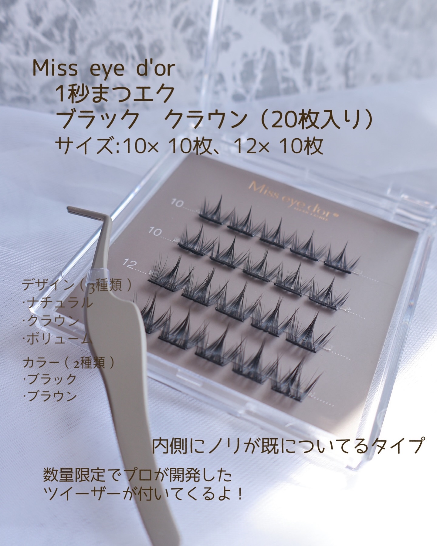 簡単に装着できる次世代つけまつ毛 1秒で付けられる、のり不要のつけまつ毛なんです𖠶𖠶 まつ毛の下からつけるので目を閉じてもわかりにくいところが🙆♀️ 初回数量限定でプロが開発したツイーザーが付いてます💓