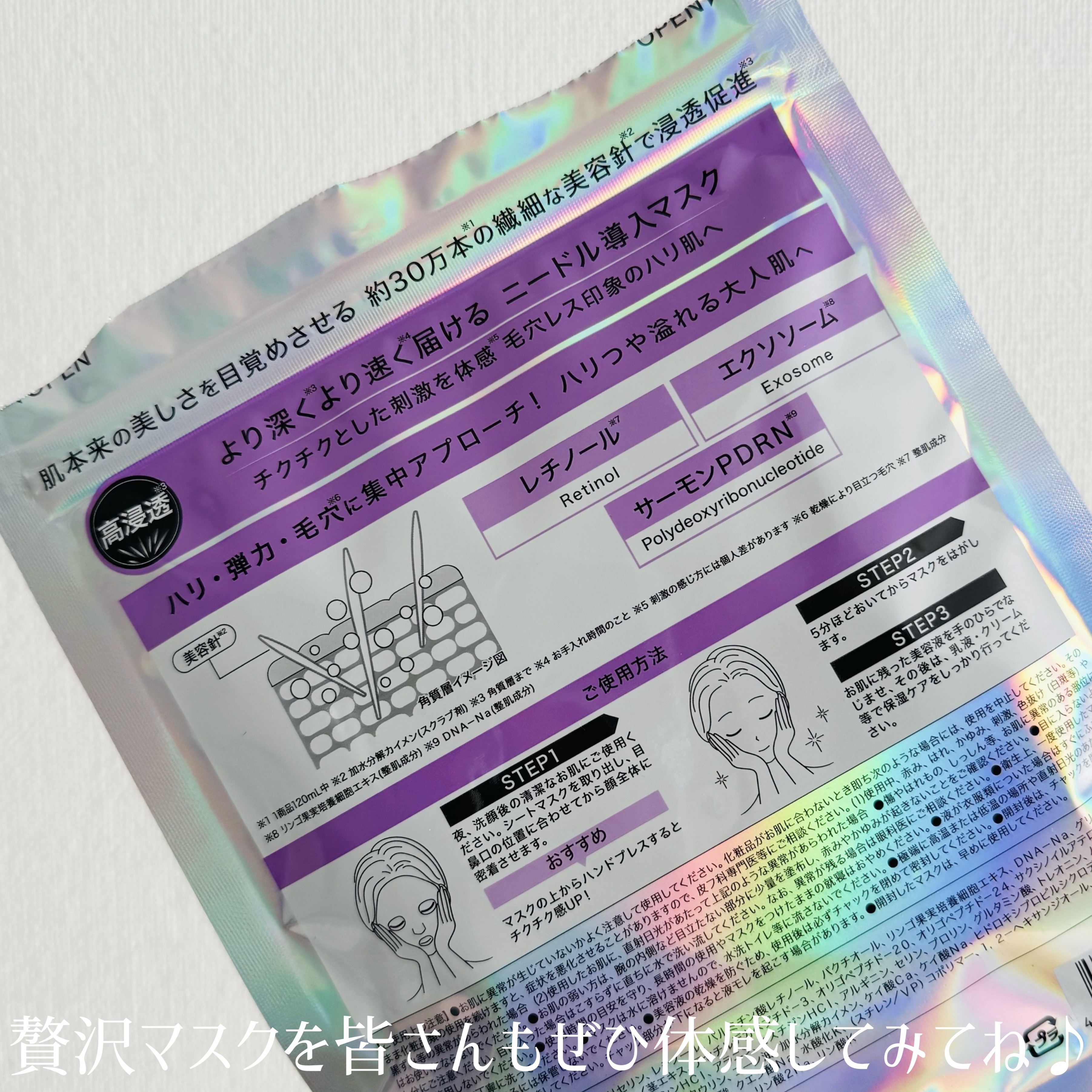 fractionalCCニードルマスクA針※1導入マスクで浸透促進※2高浸透※2ニードル導入マスク※1加水分解カイメン(スクラブ剤)※2角質層まで使い方夜のみご使用ください!①シートマスクを取り出し、顔全体に密着させます。\おすすめ/マスクの...