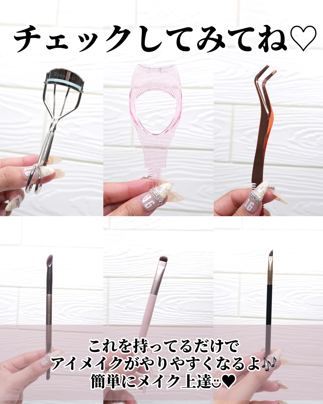 ①指でベタ塗りしない ②濃い色を広く入れすぎない ③目頭側に広く色を入れない ④下目尻は2色混ぜて使う ⑤色の境目はぼかすorラメをのせる ⑥涙袋の影は入れすぎない ⑦涙袋にラメを乗せすぎない ⑧マスカラ・グリッターはつける量を調節する ⑨マスカラのダマはコームでとかす ⑩アイラインは目尻だけ