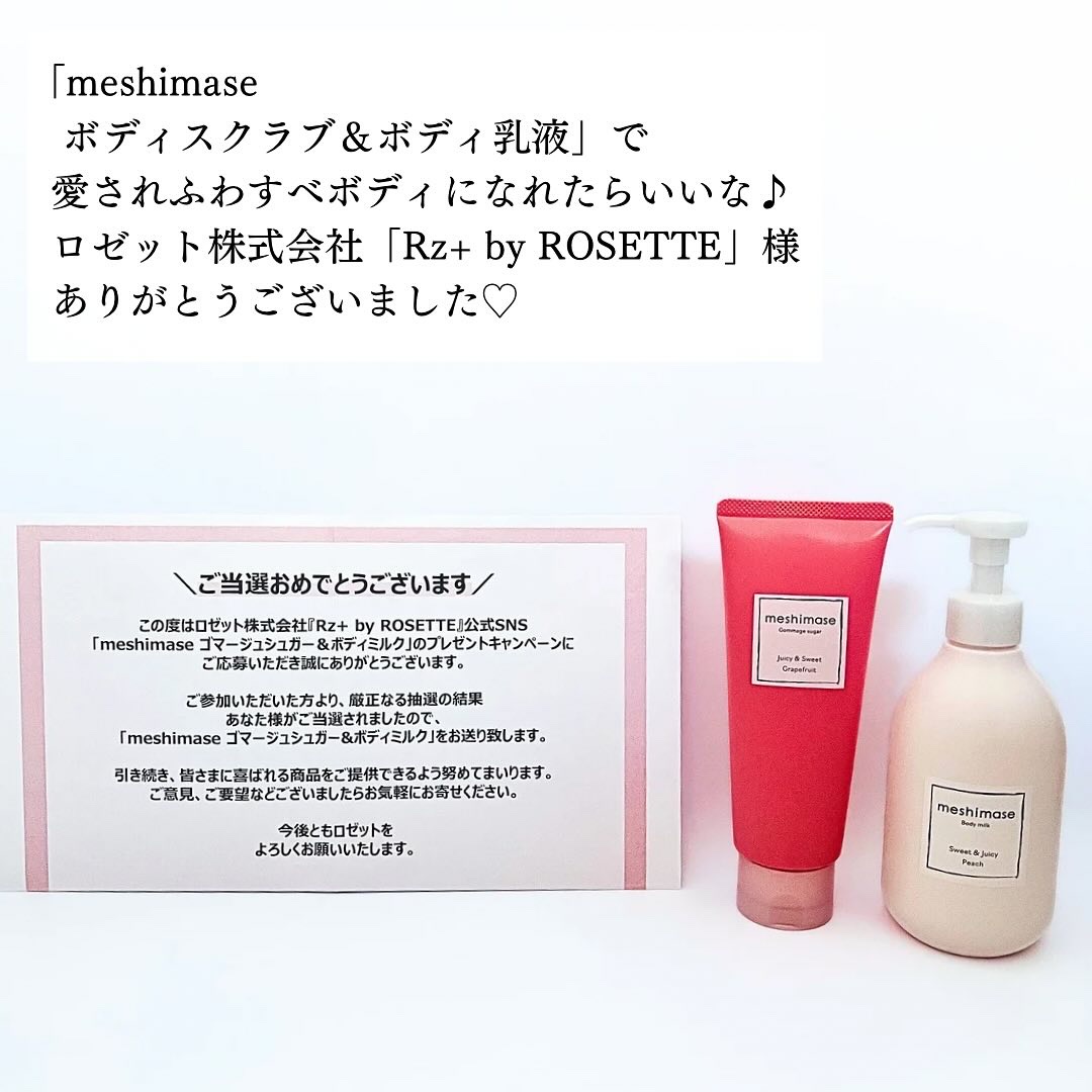 お風呂でつるすべ肌目指します😃 RZ+by ROSETTE公式様からmeshimaseボディミルクとゴマージュシュガー提供して頂きました。 この度はありがとうございます。