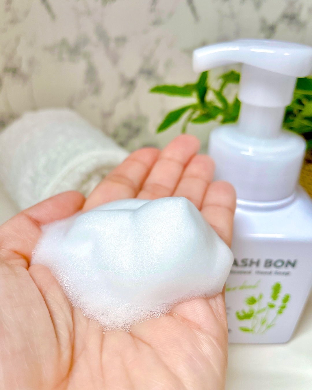 洗面台や手洗いスペースをおしゃれに演出するシンプルデザインだよ〜♡ これ、キッチンなどに置いても良いね♡ ポンプ式で押すとやわらかいふわふわ泡が出てきます。天然精油100%の香り(イランイラン&ラベンダー)だよ♡ このやさしい泡と香りが良いです〜🥺❤️