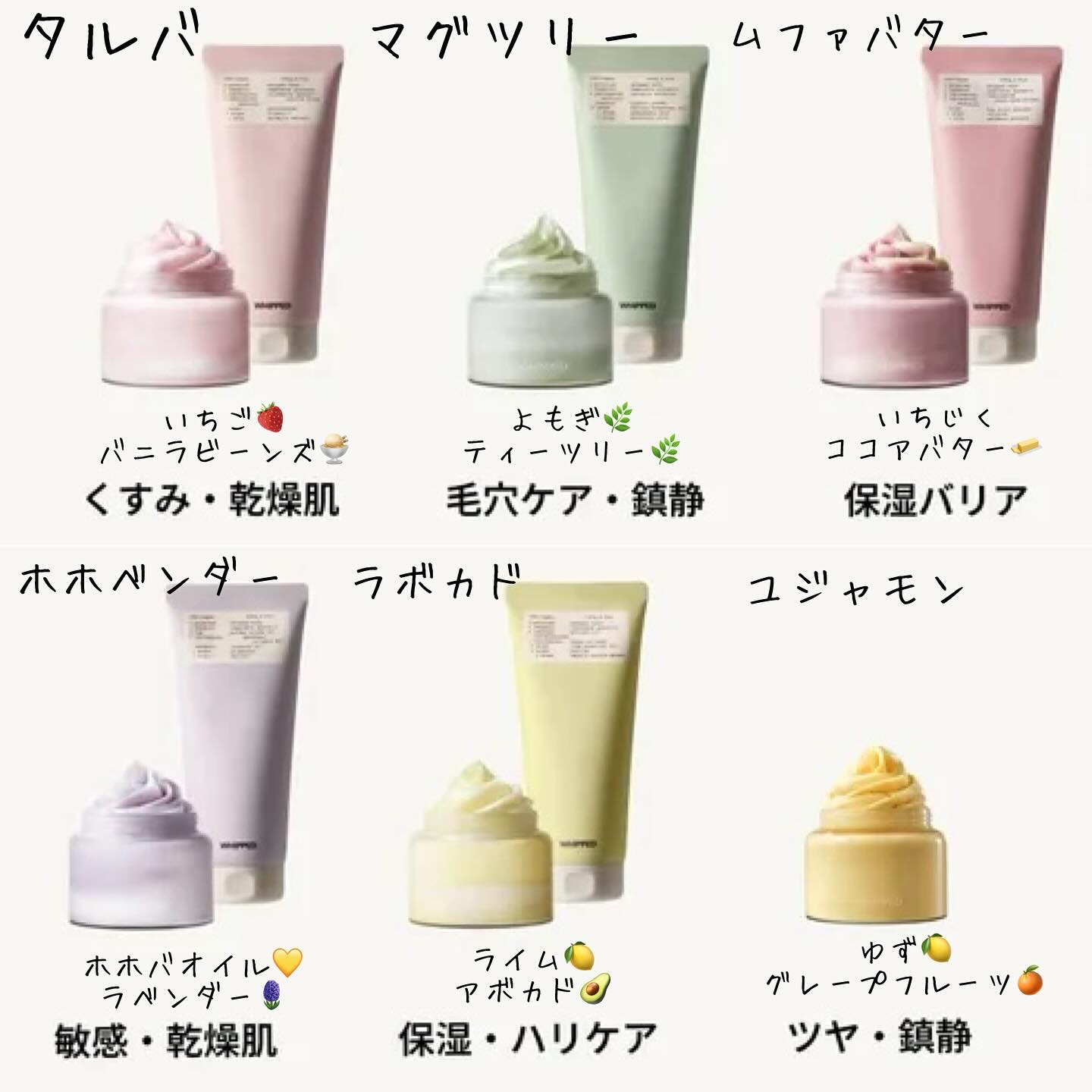 - <タルバ> グリセリン、ココイルイセチオン酸Na、精製水、ヤシ脂肪酸、ナイアシンアミド、セテアリルアルコール、1,2-ヘキサンジオール、ココベタイン、ミリスチン酸、イセチオン酸Na、ステアリン酸、ポリクオタニウム-67、アラキジン酸、セラミドNP、オレンジ果皮油、ラウリン酸、パルミチン酸、ヒアルロン酸 Na、いちごパウダー、レモン果皮油、ベルガモット果実油、ライム油、塩化Na、糖水解物、水添レシチン、オレイン酸、酢酸Na、クチナシ果実エキス、バニラ果実エキス、デキストリン、香料、リナロール、安息香酸ベンジル、シトラール、リモネン <ラボカド> グリセリン、ココイルイセチオン酸Na、精製水、ヤシ脂肪酸、ナイアシンアミド、1,2-ヘキサンジオール、セテアリルアルコール、ココ ベタイン、アボカド油、ミリスチン酸、イセチオン酸Na、ステアリン酸、デ ヒドロ酢酸Na、レモン果皮油、BG、ヒアルロン酸Na、ツボクサエキス、バニラ果実エキス、クチナシ果実エキス、ラウリン酸、セラミドNP、グレープフルーツ果皮油、ライム 油、オレイン酸、パルミチン酸、塩化Na、ポリクオタニウム-67、デキストリ ン、水添レシチン、アラキジン酸、糖水解物、PG、シトラール、リモネン <ホホベンダー> グリセリン、ココイルイセチオン酸Na、精製水、ヤシ脂肪酸、ナイアシンアミド、セテアリルアルコール、1,2-ヘキサンジオール、ココベタイン、ミリスチン酸、イセチオン酸Na、ステアリン酸、ヒアルロン酸Na、水添レ シチン、パルミチン酸、ポリクオタニウム-67、ローズマリー油、オレイン酸、オレンジ 果皮油、セラミドNP、アラキジン酸、ホホバ種子油、塩化Na、クチナシ果実エキス、グレープフルーツ果皮油、D-パンテノール、酢酸Na、ラウリン酸、ラベンダー油、デキストリン、リナロール、リモネン <マグツリー> グリセリン、ココイルイセチオン酸Na、精製水、ヤシ脂肪酸、ナイアシンアミド、1,2-ヘキサンジオール、セテアリルアルコール、ココ ベタイン、ミリスチン酸、イセチオン酸Na、ステアリン酸、カワラヨモギパウダー、ツボクサエキス、セラミドNP、オレイン酸、BG、ラウリン酸、レモン果皮油 オレンジ果皮油、塩化Na、パルミチン酸、ゼラニウム油、ヒアルロン酸Na、水添レシ チン、酢酸Na、デキストリン、PG、ポリクオタニウム-67, アラキジン酸、クチナシ果実エ キス、ティーツリー葉油、ローズマリー油、ゲラニオール、シトロネロール、シトラール、リモネン、リナロール