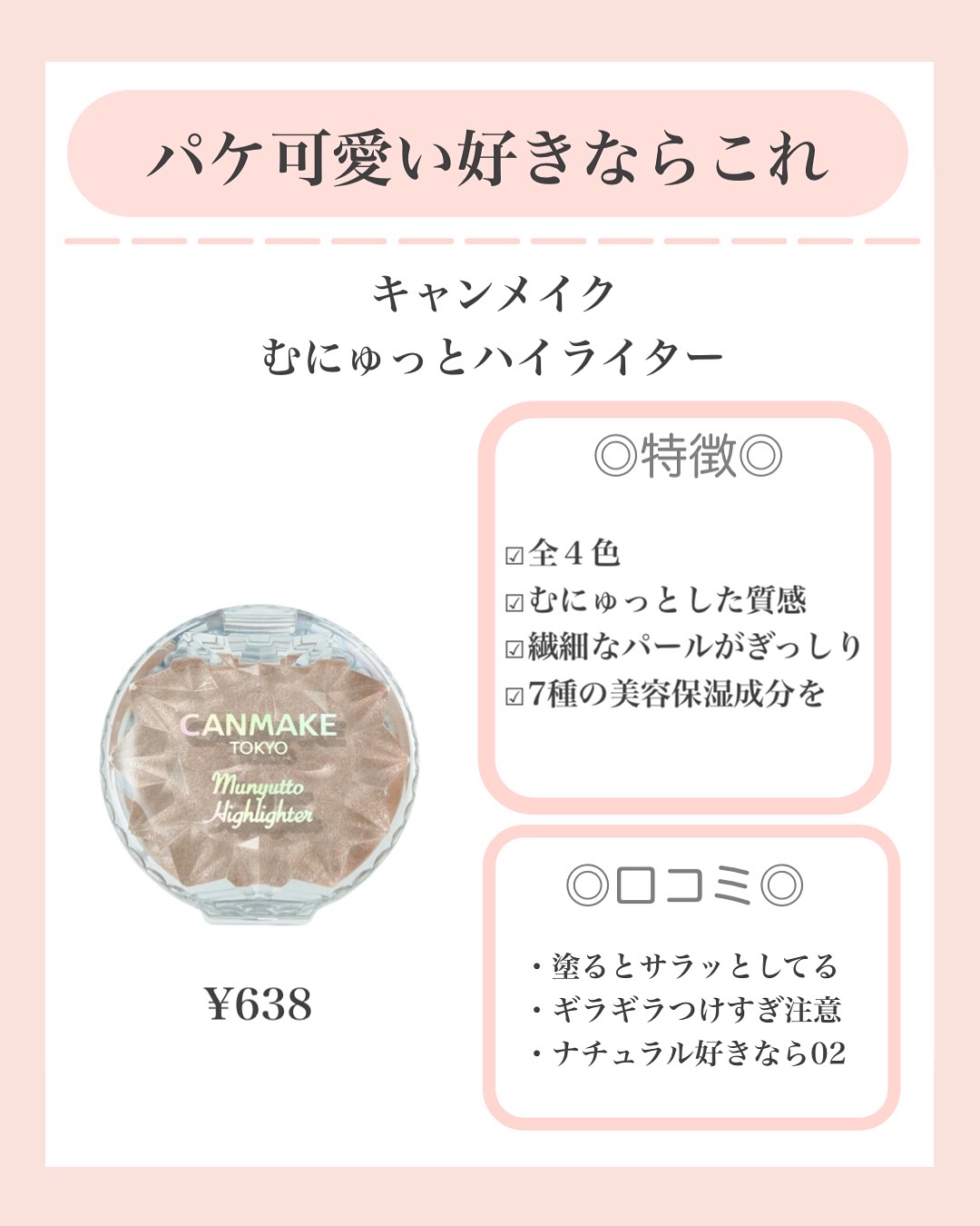 ラメが大粒でちゅるちゅる感がある パーフェクトダイアリーはしっとりしたパウダー、 CHANELは濡れたような質感のバームです! CHANELは保湿感が高いぶん、夏はヨレやすいです。 ふわっと発光して透明感が出る muiceは細かくてしっとりした粉質で、 キラキラ感もありつつ、自然に立体感が出ます。 クレ・ド・ポー ボーテは肌を綺麗に補正しつつ、 自然な立体感が出せます! ナチュラルな艶肌がつくれる ロムアンドは肌に溶け込むシルキーな質感のツヤで、 Diorは華やかさもありつつ、肌に溶け込んで ナチュラルなツヤ肌がつくれます! ギラギラのパールで光沢感たっぷり キャンメイクは透けたような濡れツヤ感で、 セザンヌはギラギラした光沢感があります! 初心者さん向けでナチュラル excelはしっとりした質感でヴェールをかけたような 上品なツヤ感で、キャンメイクはサラサラな粉質で 少し粉飛びがあり、上品なツヤ感です!