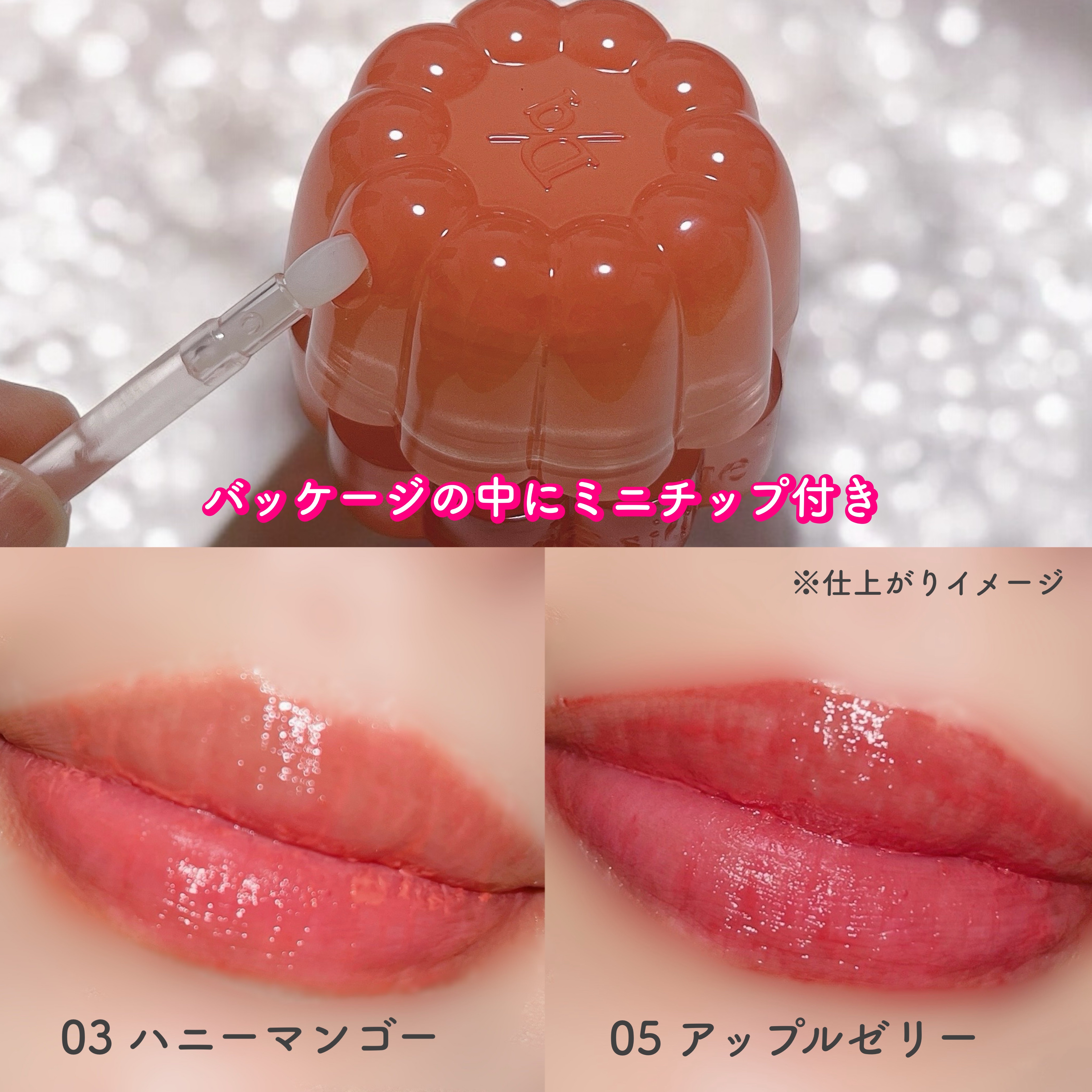 - <01 パパイヤクリーム> 水、ヘキサ(ヒドロキシステアリン酸/ステアリン酸/ロジン酸)ジペンタエリスリチル、トリエチルヘキサノイン、BG、グリセリン、オクチルドデカノール、ポリソルベート60、プロパンジオール、(PEG-240/デシルテトラデセス-20/HDI)コポリマー、1,2-ヘキサンジオール、セテアレス-20、フェノキシエタノール、エチルセルロース、カプリル酸グリセリル、(アクリル酸ヒドロキシエチル/アクリロイルジメチルタウリンNa)コポリマー、トリイソステアリン酸ポリグリセリル-2、リンゴ酸ジイソステアリル、酸化チタン、スクワラン、(アクリレーツ/アクリル酸アルキル(C10-30))クロスポリマー、トロメタミン、香料、エチルヘキシルグリセリン、黄4、赤104(1)、黄5、赤227、エチレンジアミンジコハク酸3Na、イソステアリン酸ソルビタン、ジイソステアリン酸ポリグリセリル-2、リナロール、ラウリン酸K、トコフェロール、青1 <02 ピーチドロップ> 水、ヘキサ(ヒドロキシステアリン酸/ステアリン酸/ロジン酸)ジペンタエリスリチル、トリエチルヘキサノイン、BG、グリセリン、オクチルドデカノール、ポリソルベート60、プロパンジオール、(PEG-240/デシルテトラデセス-20/HDI)コポリマー、1,2-ヘキサンジオール、セテアレス-20、フェノキシエタノール、リンゴ酸ジイソステアリル、酸化チタン、エチルセルロース、カプリル酸グリセリル、(アクリル酸ヒドロキシエチル/アクリロイルジメチルタウリンNa)コポリマー、トリイソステアリン酸ポリグリセリル-2、スクワラン、(アクリレーツ/アクリル酸アルキル(C10-30))クロスポリマー、トロメタミン、香料、エチルヘキシルグリセリン、黄5、赤104(1)、赤227、黄4、エチレンジアミンジコハク酸3Na、イソステアリン酸ソルビタン、ジイソステアリン酸ポリグリセリル-2、青1、リナロール、ラウリン酸K、トコフェロール <03 ハニーマンゴ> 水、ヘキサ(ヒドロキシステアリン酸/ステアリン酸/ロジン酸)ジペンタエリスリチル、トリエチルヘキサノイン、BG、グリセリン、オクチドデカノール、ポリソルベート60、プロパンジオール、(PEG-240/デシルテトラデセス-20/HDI)コポリマー、1,2-ヘキサンジオール、セテアレス-20、フェノキシエタノール、エチルセルロース、リンゴ酸ジイソステアリル、カプリル酸グリセリル、酸化チタン、(アクリル酸ヒドロキシエチル/アクリロイルジメチルタウリンNa)コポリマー、トリイソステアリン酸ポリグリセリル-2、スクワラン、(アクリレーツ/アクリル酸アルキル(C10-30))クロスポリマー、トロメタミン、香料、エチルヘキシルグリセリン、赤104(1)、黄5、赤227、黄4、エチレンジアミンジコハク酸3Na、イソステアリン酸ソルビタン、ジイソステアリン酸ポリグリセリル-2、リナロール、ラウリン酸K、トコフェロール、青1 <04 ピンクバブル> 水、ヘキサ(ヒドロキシステアリン酸/ステアリン酸/ロジン酸)ジペンタエリスリチル、トリエチルヘキサノイン、BG、グリセリン、オクチドデカノール、ポリソルベート60、プロパンジオール、(PEG-240/デシルテトラデセス-20/HDI)コポリマー、1,2-ヘキサンジオール、セテアレス-20、フェノキシエタノール、エチルセルロース、カプリル酸グリセリル、トリイソステアリン酸ポリグリセリル-2、(アクリル酸ヒドロキシエチル/アクリロイルジメチルタウリンNa)コポリマー、スクワラン、(アクリレーツ/アクリル酸アルキル(C10-30))クロスポリマー、リンゴ酸ジイソステアリル、酸化チタン、トロメタミン、香料、エチルヘキシルグリセリン、赤104(1)、酸化鉄、赤227、エチレンジアミンジコハク酸3Na、ジイソステアリン酸ポリグリセリル-2、黄4、イソステアリン酸ソルビタン、黄5、リナロール、ラウリン酸K、トコフェロール <05 アップルゼリー> 水、ヘキサ(ヒドロキシステアリン酸/ステアリン酸/ロジン酸)ジペンタエリスリチル、トリエチルヘキサノイン、BG、グリセリン、オクチドデカノール、ポリソルベート60、プロパンジオール、(PEG-240/デシルテトラデセス-20/HDI)コポリマー、1,2-ヘキサンジオール、セテアレス-20、フェノキシエタノール、トリイソステアリン酸ポリグリセリル-2、エチルセルロース、カプリル酸グリセリル、(アクリル酸ヒドロキシエチル/アクリロイルジメチルタウリンNa)コポリマー、スクワラン、(アクリレーツ/アクリル酸アルキル(C10-30))クロスポリマー、トロメタミン、香料、リンゴ酸ジイソステアリル、酸化チタン、エチルヘキシルグリセリン、赤227、黄5、赤104(1)、黄4、エチレンジアミンジコハク酸3Na、ジイソステアリン酸ポリグリセリル-2、イソステアリン酸ソルビタン、リナロール、ラウリン酸K、トコフェロール、青1 <06 クアバキャンディ> 水、ヘキサ(ヒドロキシステアリン酸/ステアリン酸/ロジン酸)ジペンタエリスリチル、トリエチルヘキサノイン、BG、グリセリン、オクチドデカノール、ポリソルベート60、プロパンジオール、(PEG-240/デシルテトラデセス-20/HDI)コポリマー、1,2-ヘキサンジオール、セテアレス-20、フェノ