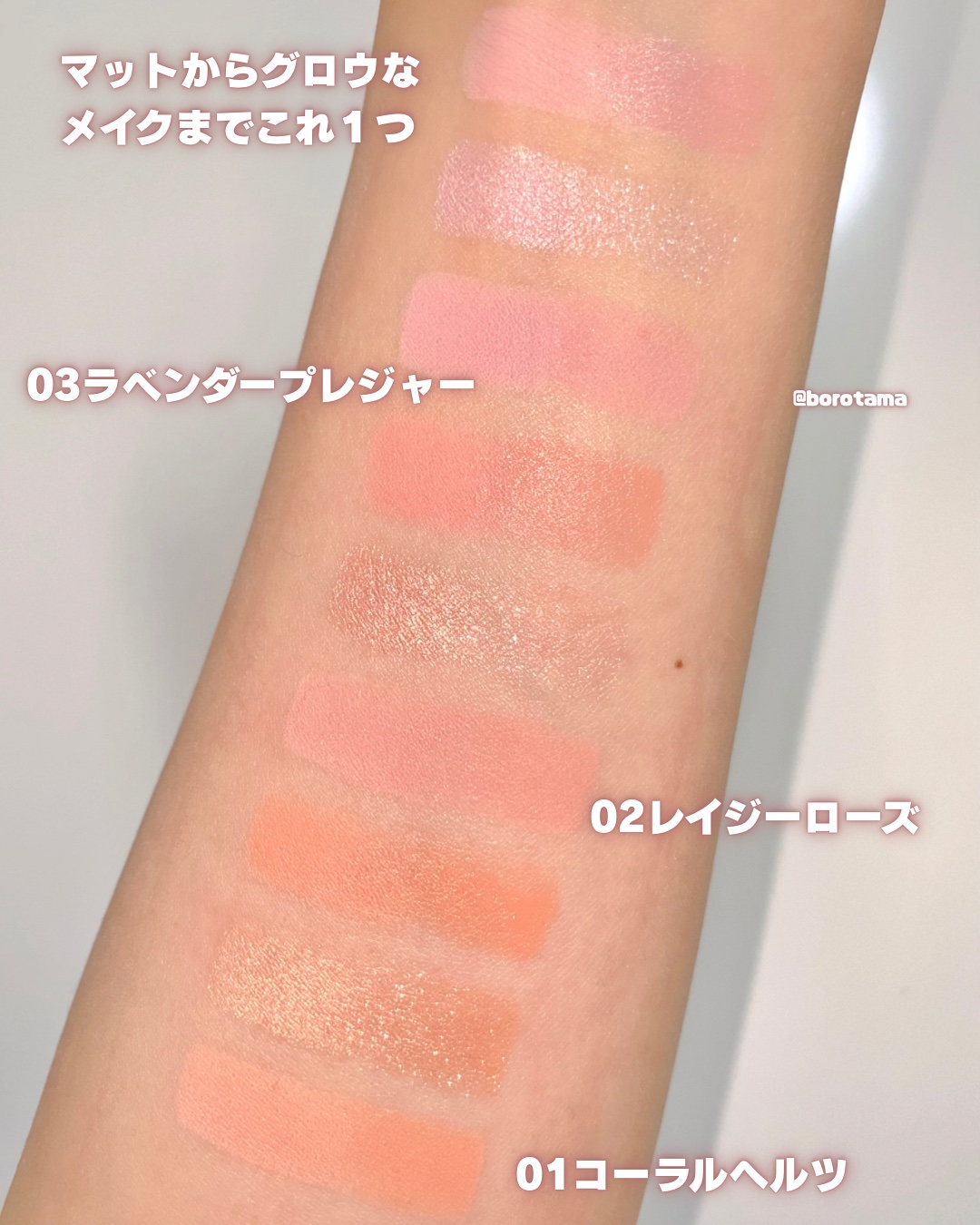 - <04 ピーチフラッシュ> 1Sweet ジメチコン、合成フルオロフロゴパイト、マイカ、酸化チタン、ジフェニルシロキシフェニルトリメチコン、ポリプロピレン、ポリメチルシルセスキオキサン、リンゴ酸ジイソステアリル、炭酸ジカプリリル、ホウケイ酸(Ca/チタン)、ヘキサ(ヒドロキシステアリン酸/ステアリン酸/ロジン酸)ジペンタエリスリチル、(ジメチコン/ビニルジメチコン)クロスポリマー、ステアロイルオキシステアリン酸オクチルドデシル、タルク、ポリイソブテン、1,2-ヘキサンジオール、水添レシチン、酸化スズ、カプリル酸グリセリル、シリカ、酸化鉄、トリエトキシカプリリルシラン、トコフェロール 2Fairy ジメチコン、マイカ、タルク、酸化チタン、ジフェニルシロキシフェニルトリメチコン、ステアリン酸Mg、(ジメチコン/ビニルジメチコン)クロスポリマー、リンゴ酸ジイソステアリル、水添ポリ(C6-14オレフィン)、酸化鉄、ポリプロピレン、水添レシチン、シリカ、カルミン、1,2-ヘキサンジオール、トリエトキシカプリリルシラン、マンガンバイオレット、カプリル酸グリセリル、ラウロイルリシン、水酸化Al、マルトデキストリン、カオリン 3Brown タルク、マイカ、酸化鉄、グンジョウ、窒化ホウ素、シリカ、(ビニルジメチコン/メチコンシルセスキオキサン)クロスポリマー、エチルヘキサン酸セチル、ステアリン酸Mg、トリ(カプリル酸/カプリン酸)グリセリル、ヘキサ(ヒドロキシステアリン酸/ステアリン酸/ロジン酸)ジペンタエリスリチル、マンガンバイオレット、カルミン、カオリン、1,2-ヘキサンジオール、ジメチコン、トリエトキシカプリリルシラン、水添レシチン、カプリル酸グリセリル、マルトデキストリン 4Candy ジメチコン、マイカ、酸化チタン、合成フルオロフロゴパイト、ジフェニルシロキシフェニルトリメチコン、ポリプロピレン、ポリメチルシルセスキオキサン、リンゴ酸ジイソステアリル、炭酸ジカプリリル、ヘキサ(ヒドロキシステアリン酸/ステアリン酸/ロジン酸)ジペンタエリスリチル、タルク、(ジメチコン/ビニルジメチコン)クロスポリマー、ステアロイルオキシステアリン酸オクチルドデシル、ポリイソブテン、カルミン、黄4、1,2-ヘキサンジオール、水添レシチン、酸化鉄、カプリル酸グリセリル、シリカ、酸化スズ、トリエトキシカプリリルシラン、マルトデキストリン、トコフェロール 5Peach ジメチコン、マイカ、タルク、ジフェニルシロキシフェニルトリメチコン、ステアリン酸Mg、酸化チタン、(ジメチコン/ビニルジメチコン)クロスポリマー、黄4、リンゴ酸ジイソステアリル、カルミン、水添ポリ(C6-14オレフィン)、酸化鉄、ポリプロピレン、水添レシチン、シリカ、1,2-ヘキサンジオール、トリエトキシカプリリルシラン、カプリル酸グリセリル、マルトデキストリン 6Mellow オクチルドデカノール、イソノナン酸イソノニル、トリイソステアリン酸ポリグリセリル-2、トリエチルヘキサノイン、テトライソステアリン酸ペンタエリスリチル、水添ポリイソブテン、酸化チタン、トリ(カプリル酸/カプリン酸)グリセリル、ダイマージリノール酸(フィトステリル/イソステアリル/セチル/ステアリル/ベヘニル)、セレシン、シリカ、ビスジグリセリルポリアシルアジペート-2、マイカ、オゾケライト、合成ワックス、ステアラルコニウムヘクトライト、セスキオレイン酸ソルビタン、ポリリシノレイン酸ポリグリセリル-6、酸化鉄、カルミン、炭酸プロピレン、黄4、ポリヒドロキシステアリン酸、イソステアリン酸、パルミチン酸エチルヘキシル、ミリスチン酸イソプロピル、レシチン、ジメチコン、デヒドロ酢酸、ポリリシノレイン酸ポリグリセリル-3、マルトデキストリン <05 ピンクフレア> 1Bare ジメチコン、合成フルオロフロゴパイト、マイカ、酸化チタン、ジフェニルシロキシフェニルトリメチコン、ポリプロピレン、タルク、ポリメチルシルセスキオキサン、リンゴ酸ジイソステアリル、炭酸ジカプリリル、ヘキサ(ヒドロキシステアリン酸/ステアリン酸/ロジン酸)ジペンタエリスリチル、(ジメチコン/ビニルジメチコン)クロスポリマー、ステアロイルオキシステアリン酸オクチルドデシル、ポリイソブテン、1,2-ヘキサンジオール、水添レシチン、酸化スズ、カプリル酸グリセリル、カルミン、シリカ、トリエトキシカプリリルシラン、酸化鉄、グンジョウ、マルトデキストリン、トコフェロール 2Blossom ジメチコン、マイカ、タルク、ジフェニルシロキシフェニルトリメチコン、ステアリン酸Mg、酸化チタン、(ジメチコン/ビニルジメチコン)クロスポリマー、リンゴ酸ジイソステアリル、水添ポリ(C6-14オレフィン)、ポリプロピレン、カルミン、水添レシチン、シリカ、グンジョウ、1,2-ヘキサンジオール、トリエトキシカプリリルシラン、酸化鉄、マンガンバイオレット、カプリル酸グリセリル、マルトデキストリン、カオリン 3Vintage タルク、マイカ、マンガンバイオレット、酸化鉄、窒