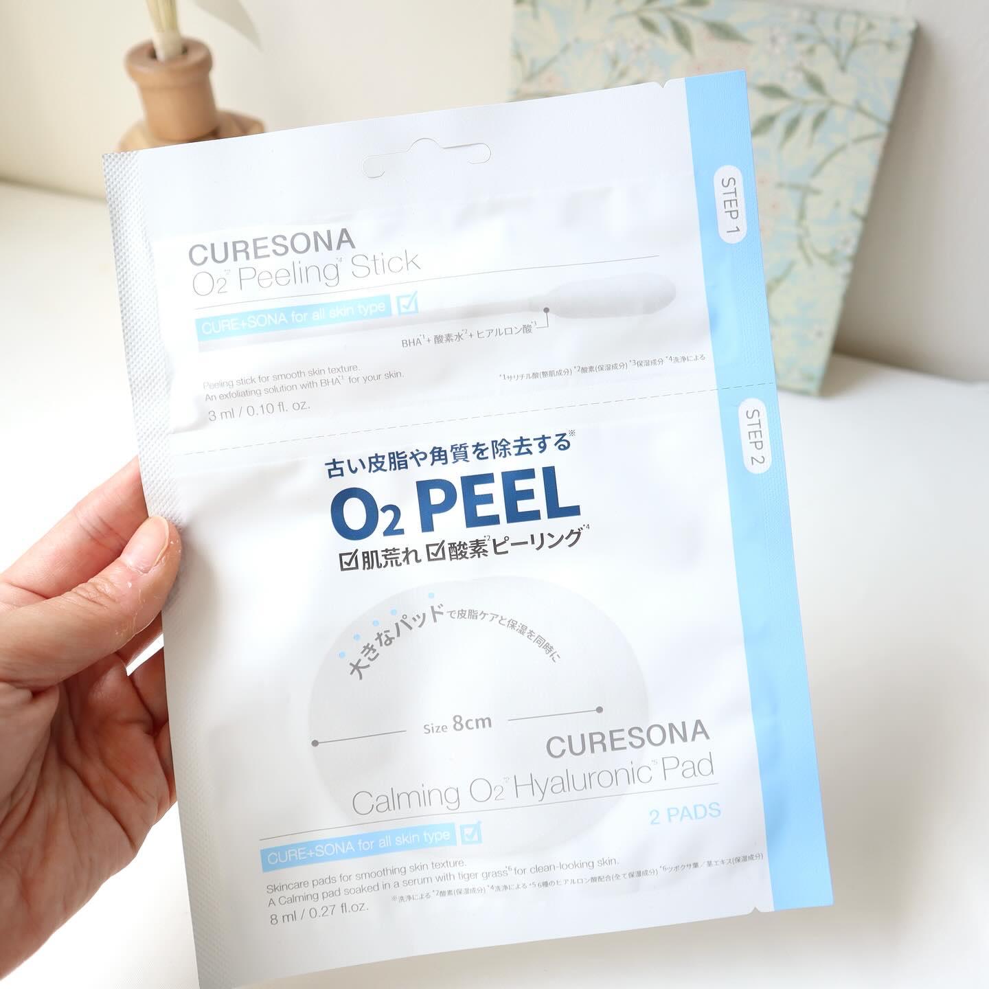 .✾CURESONA O2カーミングピーリングキット..韓国ドクターズコスメ"Dr.Oracle"から生まれたスキンケアブランド✨.STEP1は通常の約5倍の大きさの綿棒で角質・肌にたまった老廃物をきれいに除去☝🏻.STEP2は8cmのビッグ...