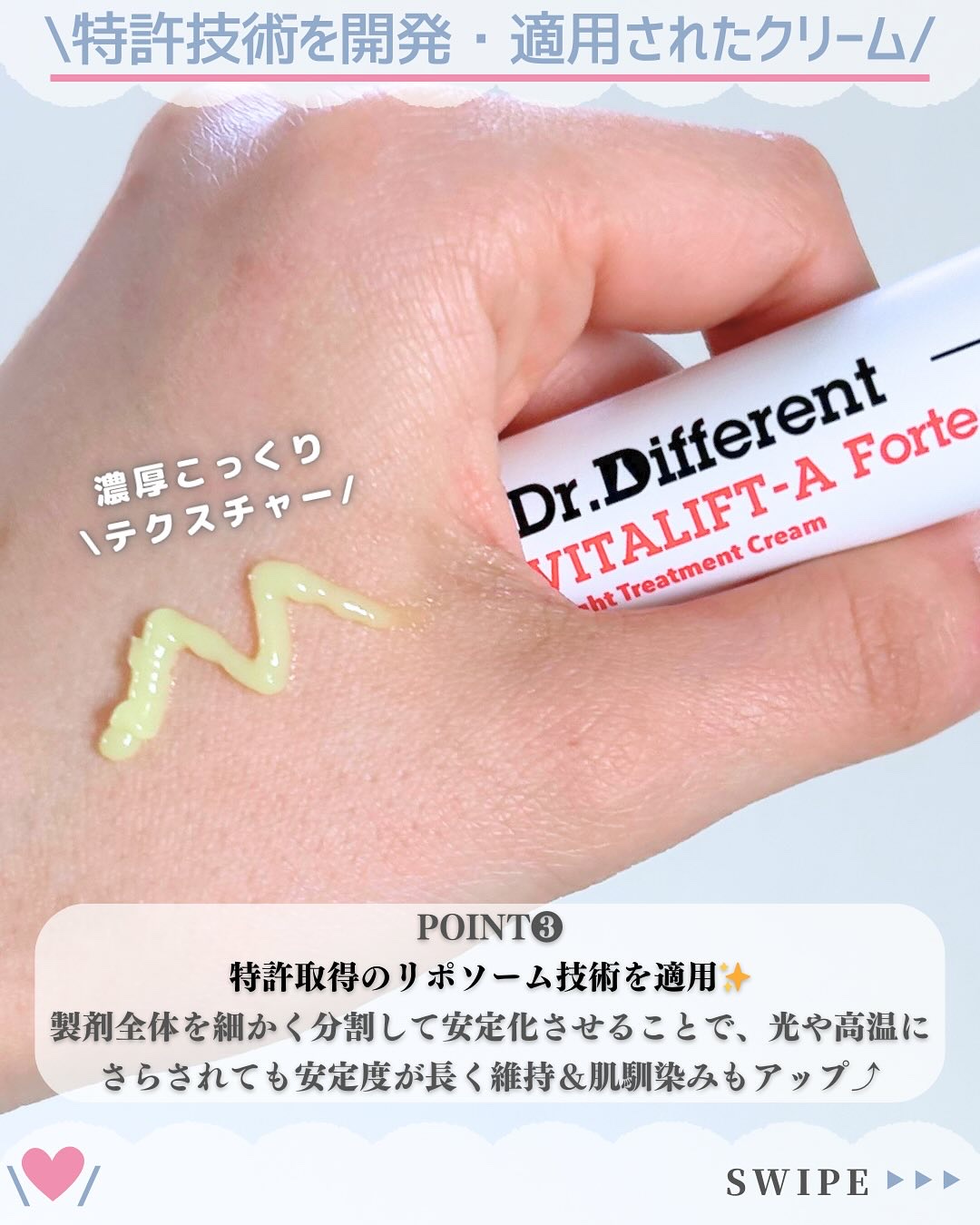 Dr.Differentビタリフト-Aフォルテ 20gレチナールクリームで有名で、様々な濃度のレチナール商品を保有したダーマコスメティックブランド👏イベントに出展してる特にお話伺った記憶があります🥰レチナールはシワケアとハリ感UP、ターンオー...