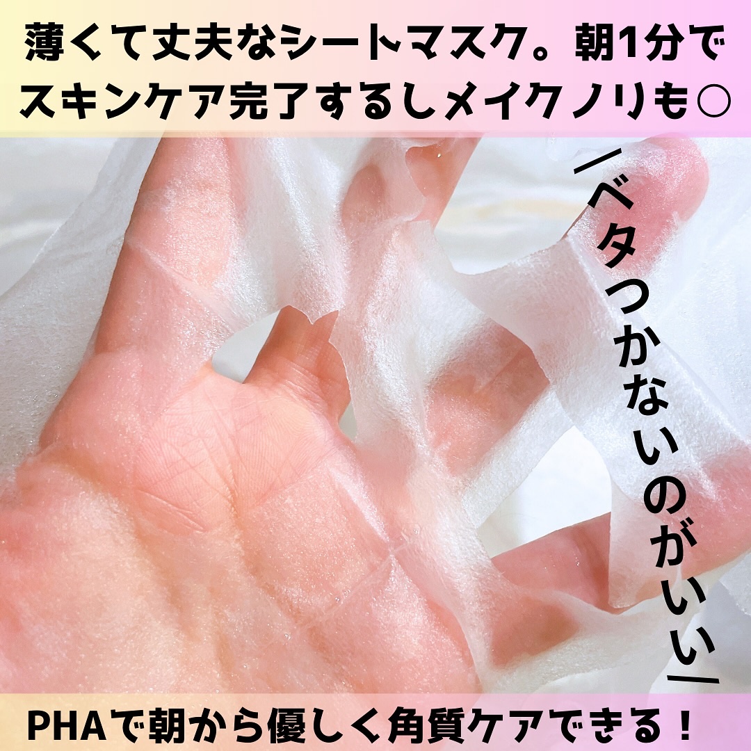 たったの1分で鎮静水分ケア! ✔︎PHAで肌の不要な角質をケア ✔︎5種のシカ成分で肌を鎮静 ✔︎11種類のヒアルロン酸で潤い補給 シートは薄めだけどたっぷりの美容液に浸されてるよ🌟 肌にピタッとフィットしてくれてさっぱりとしながらも水分をしっかりチャージしてくれるみたい✨ 1分でOK!なのが忙しい朝にさっとパック出来て嬉しい♡