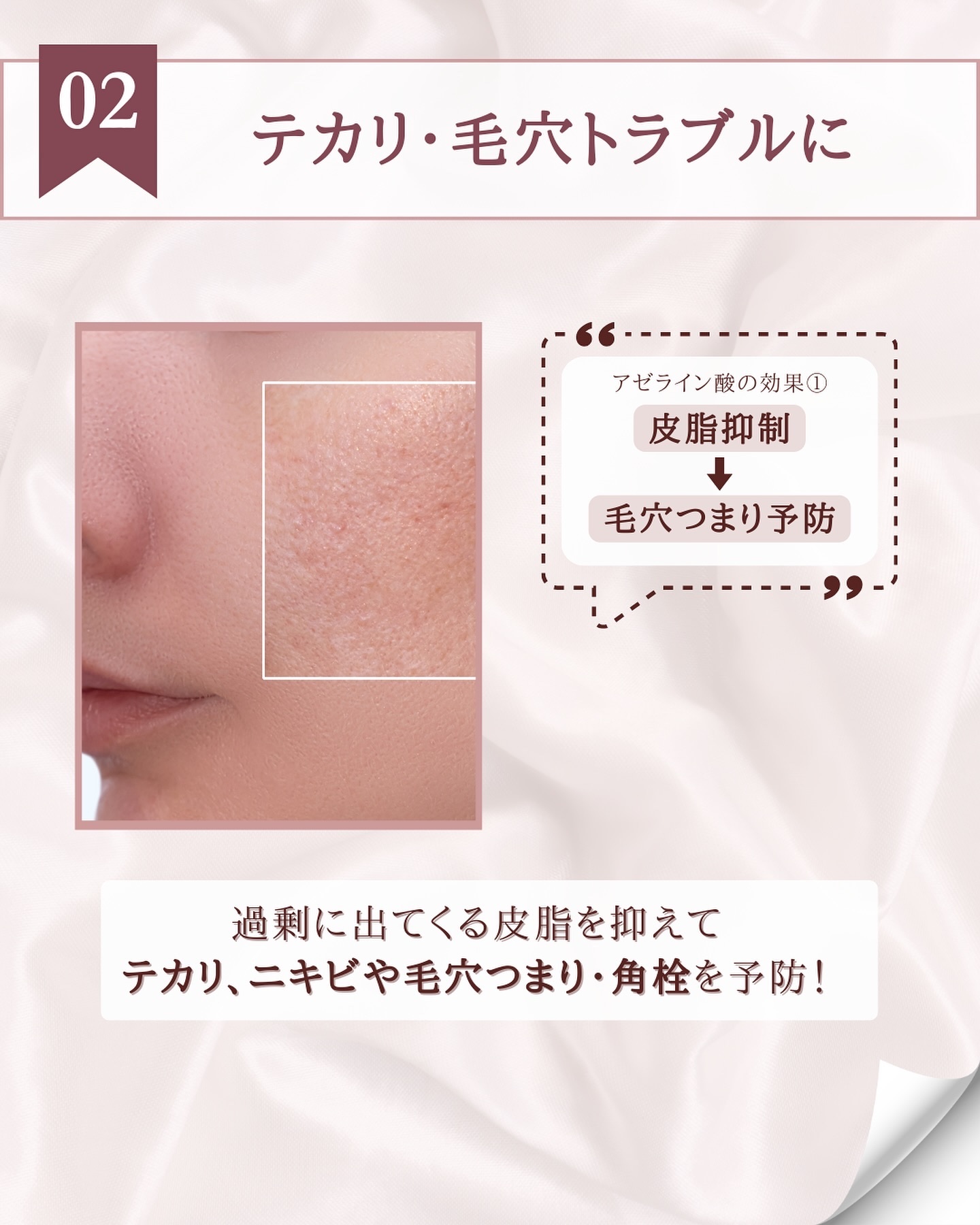 - アゼライン酸15% 配合 ※1 クリーム POINT1 アゼライン酸を特濃配合のフェイスクリーム アゼライン酸は、小麦粉やライ麦などの穀類や酵母由来の天然由来の酸であり、特に脂性肌の人にはおすすめの成分として知られている整肌成分です。肌の水分と皮脂のバランスを整えながら、滑らかな肌へと導きます。 POINT2保湿成分も配合し、守りと攻めの成分をバランスよく配合 保湿成分でもある、スクワラン・ヒアルロン酸 ※3を配合し、乾燥による肌トラブルを防ぎます。 また、ゆらぎ肌にオススメの美容成分、ツボクサエキス ( CICA )や、グリチルリチン酸2K ※4も配合し、なめらかな素肌へと導きます。アゼライン酸だけでなく、肌悩みに寄り添った様々な美容成分を配合し、守りと攻めのバランスがとれたフェイスクリームです。 〈7種類のオーガニック認証エキスを配合 ※5 。〉 ・カンゾウ根エキス ・オウゴン根エキス ・ツボクサエキス ・ローズマリー葉エキス ・カミツレ葉エキス ・チャ葉エキス ・イタドリ根エキス 〈嬉しい8つの無添加〉 ・パラベンフリー ・合成香料フリー ・合成着色料フリー ・シリコンフリー ・石油系アルコールフリー ・石油系界面活性剤フリー ・ミネラルオイルフリー ・紫外線吸収剤フリー ※1、2、3,4,5 整肌成分