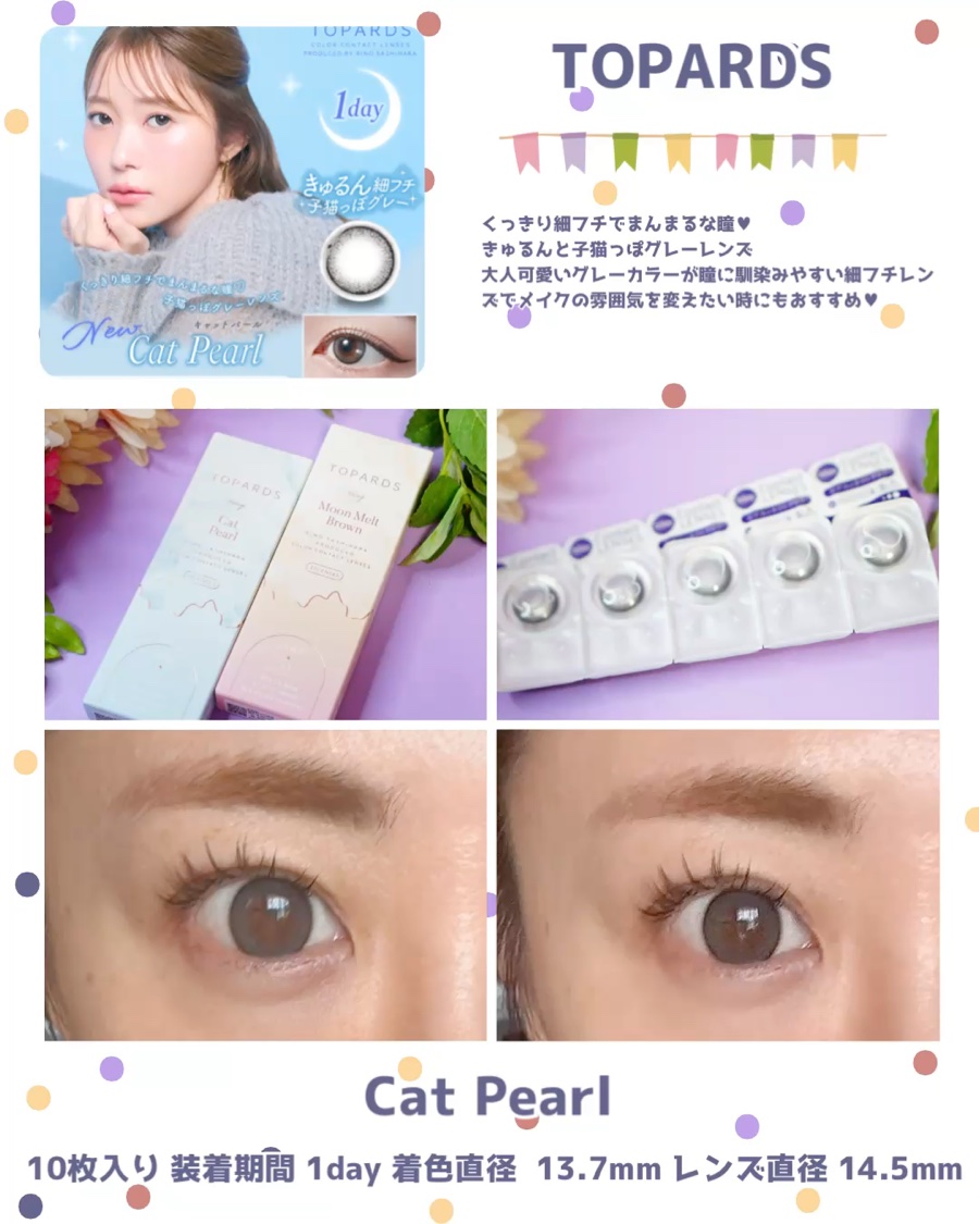 \月にとろける新色レンズ🌙/指原莉乃さんプロデュースのTOPARDSから新色が登場しました🌙うるみハイライトデザイン&大きめの着色直径で美人盛れ✴︎気になる方はぜひチェックしてみてください♡【製品概要】TOPARDSムーンメルトブラウンキャッ...