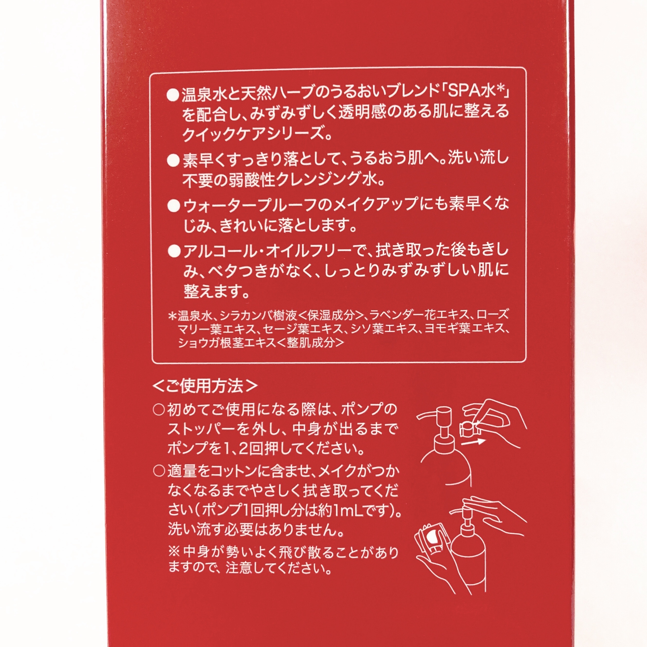 - クレンジング力と肌へのやさしさの両立にこだわった、洗い流し不要の「クレンジングウォーター ポンプヘッドタイプ」 コットンに含ませて拭き取るだけでウォータープルーフのポイントメイクも素早く落とし、ベタつきを肌に残さずフレッシュな素肌へ。繊細な肌のために、温泉水を含むうるおい成分*2を95%以上配合。 メイドインジャパンの品質は国内に留まらず、海外セレブやプロのメイクアップアーティストからも使用され、世界中で愛され続けています。 弱酸性/香料・合成色素・石油系鉱物油・アルコール不使用 パッチテスト済み ※すべての方に皮膚刺激が起こらないというわけではありません *2 精製水を含む美肌成分