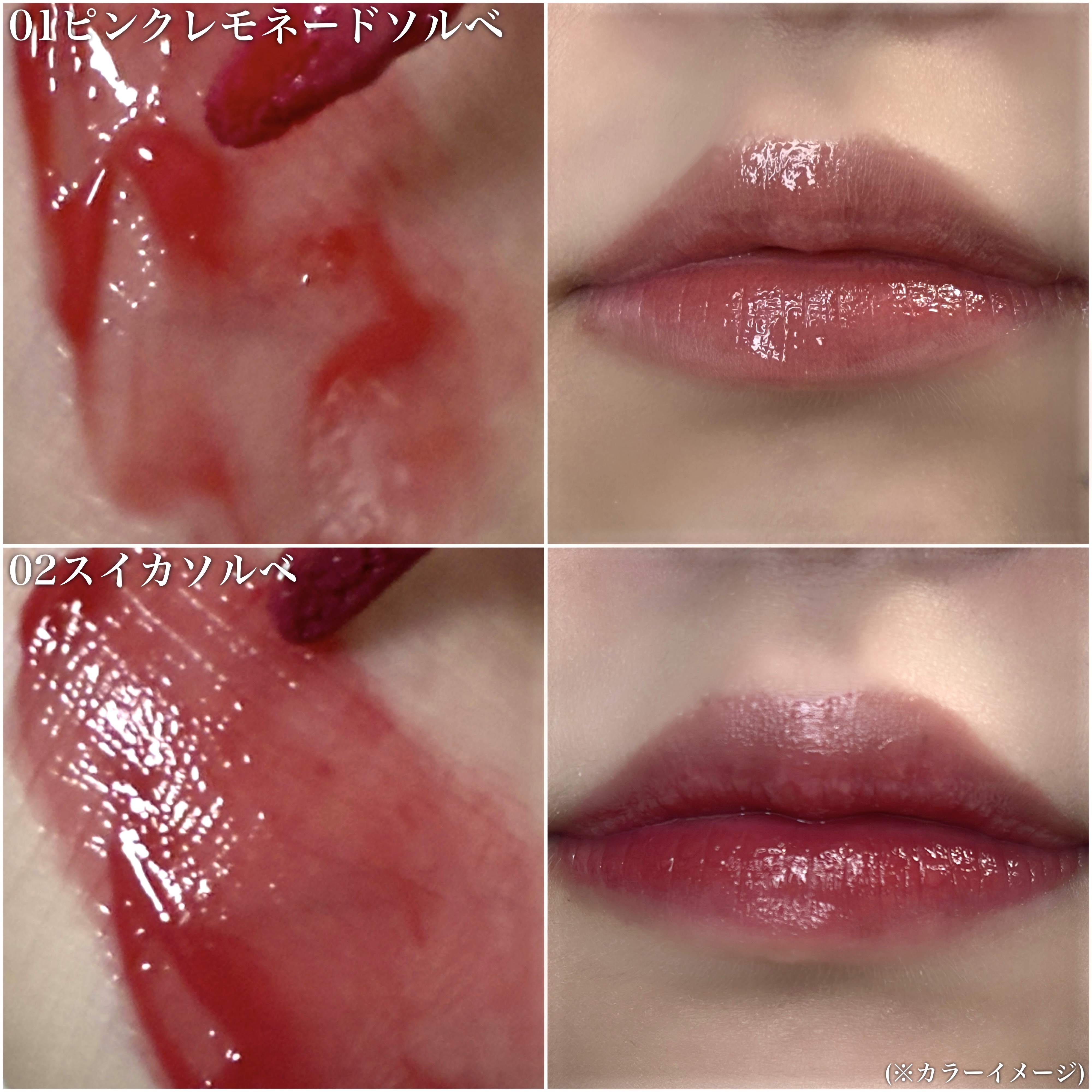 自然でほのかなツヤで“濡れツヤ唇”を演出。 塗り重ねても重くなりにくいテクスチャーで、時間が経っても透明感のあるカラーをキープします。 デイリー使いしやすいカラー展開 ジューシーラスティングティントより、シアーでしっとりとしたツヤタイプなので潤い重視の方にオススメ 重ね塗りで色調整できるので、色の組み合わせ次第ではグラデーションリップが綺麗に作れます