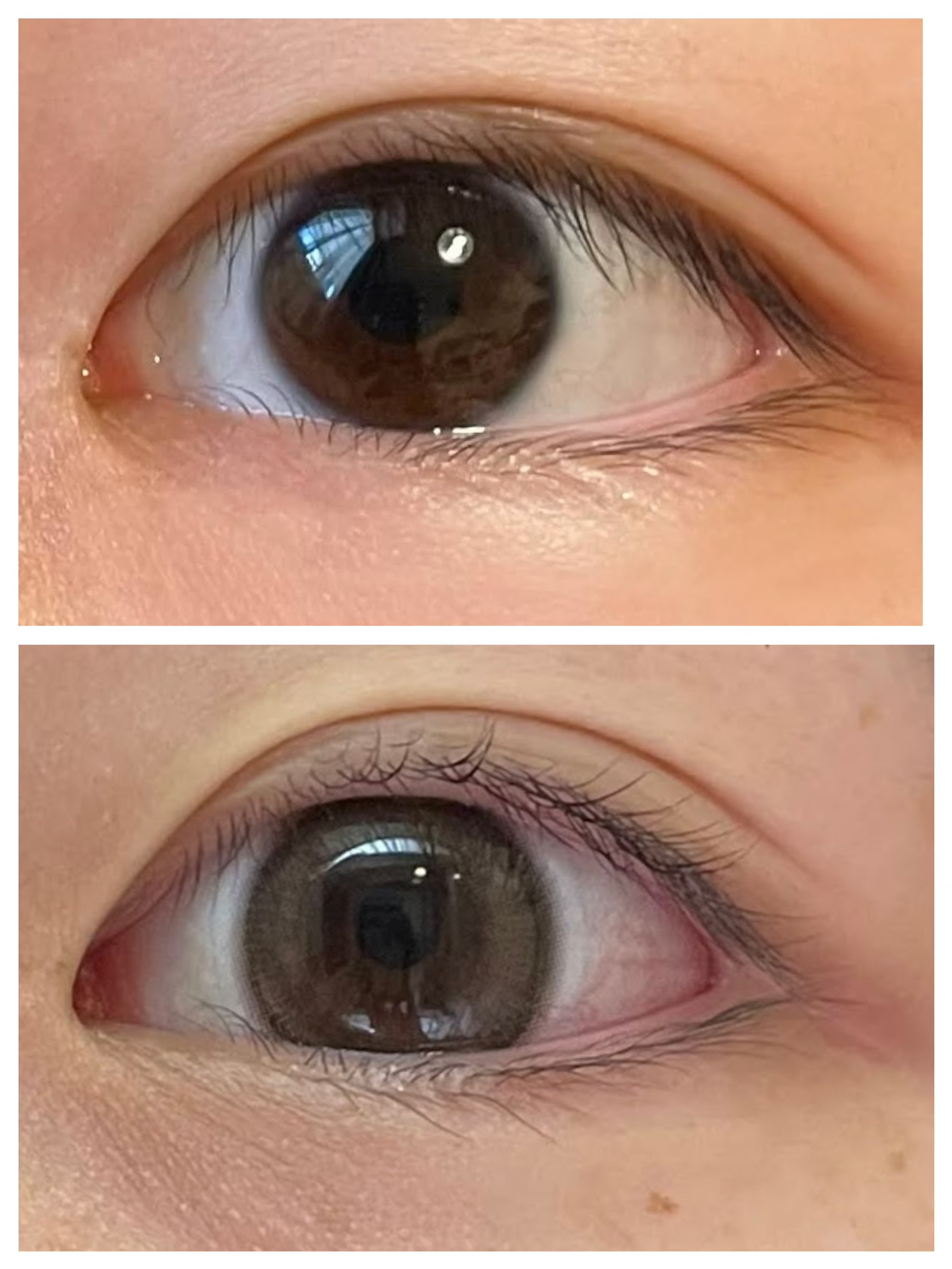 水光コンタクトのブラック 中と色の差があまりないからフチは目立たない、輪郭がはっきりする程度 ベルベージュよりも水光感は目立たなくてよりナチュラル OLENS グローイのブラックに似てる