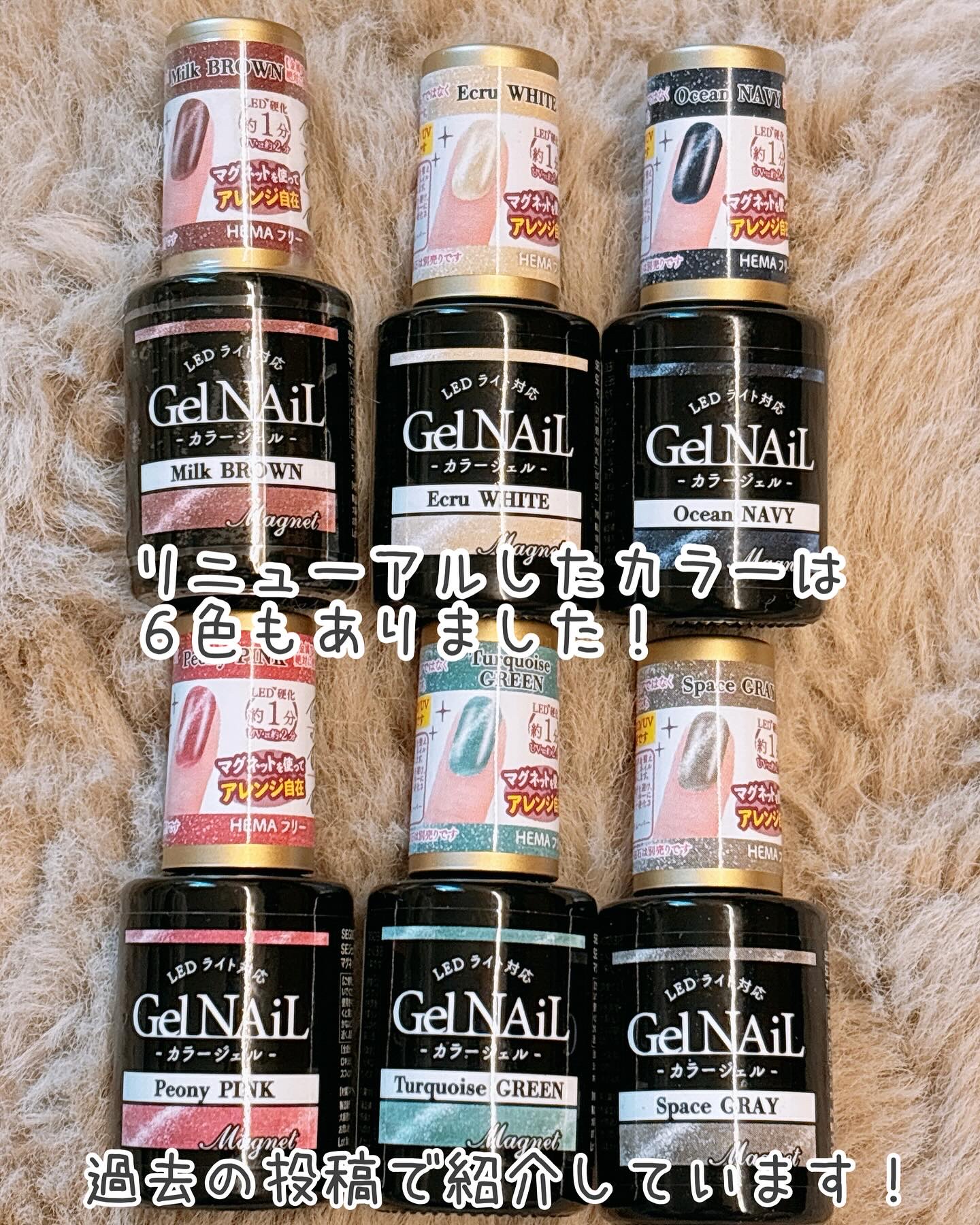 セリアのマグネットジェルは税込110円の最安値! 昨年の秋ごろ発売のカラーからリニューアルしてラメの動きがよくなっています✨ 最初に紹介した6つはリニューアルしたカラーで、 昨年発売のリニューアル前のカラーとは色味が全然違うので要注意!ラメの...