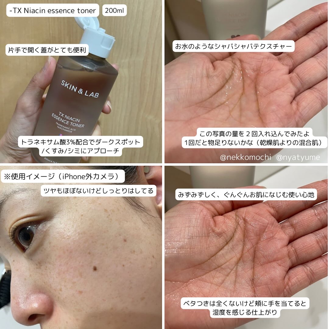 シミくすみWケアトナー✨SKIN&LABTXナイアシンエッセンストナーSKIN&LAB様からいただきました🫶✨ありがとうございます✨✨特徴・トラネキサム酸3%配合で、メラニンの生成を抑え、ダークスポット・くすみ・シミをしっかりケア。・トラネキ...