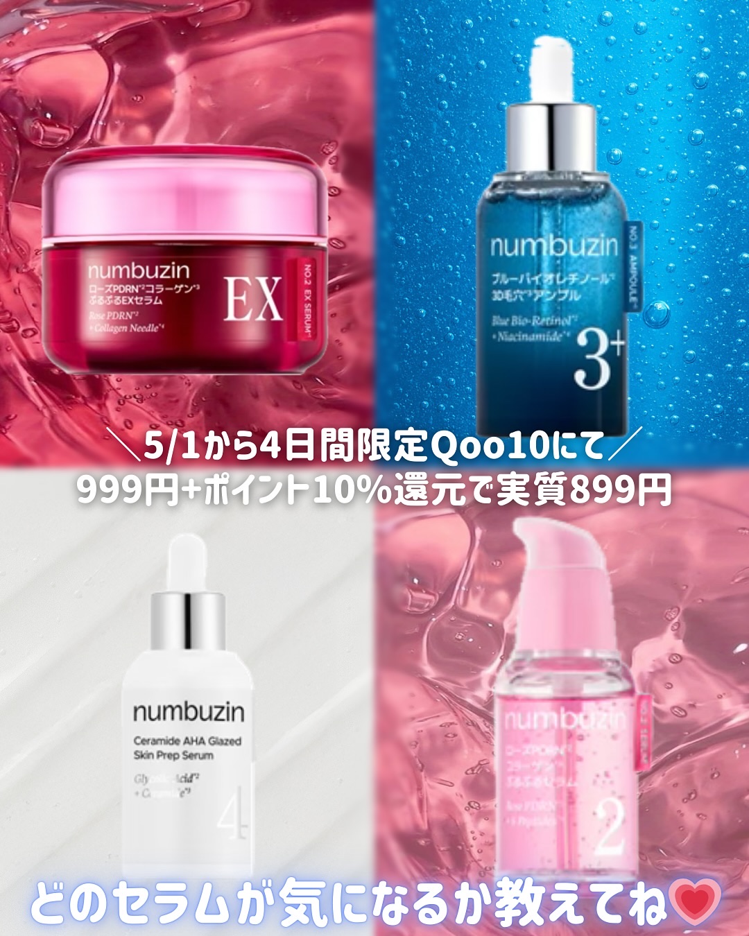 ナンバーズインから待望の新作セラム4種が2025年5月1日よりQoo10で先行発売されます!!🩷2番ローズPDRNコラーゲンぷるぷるセラム#コラーゲン爆弾セラム🍓2番ローズPDRNコラーゲンぷるぷるEXセラム#イチゴ飴セラム💙3番ブルーバイオ...