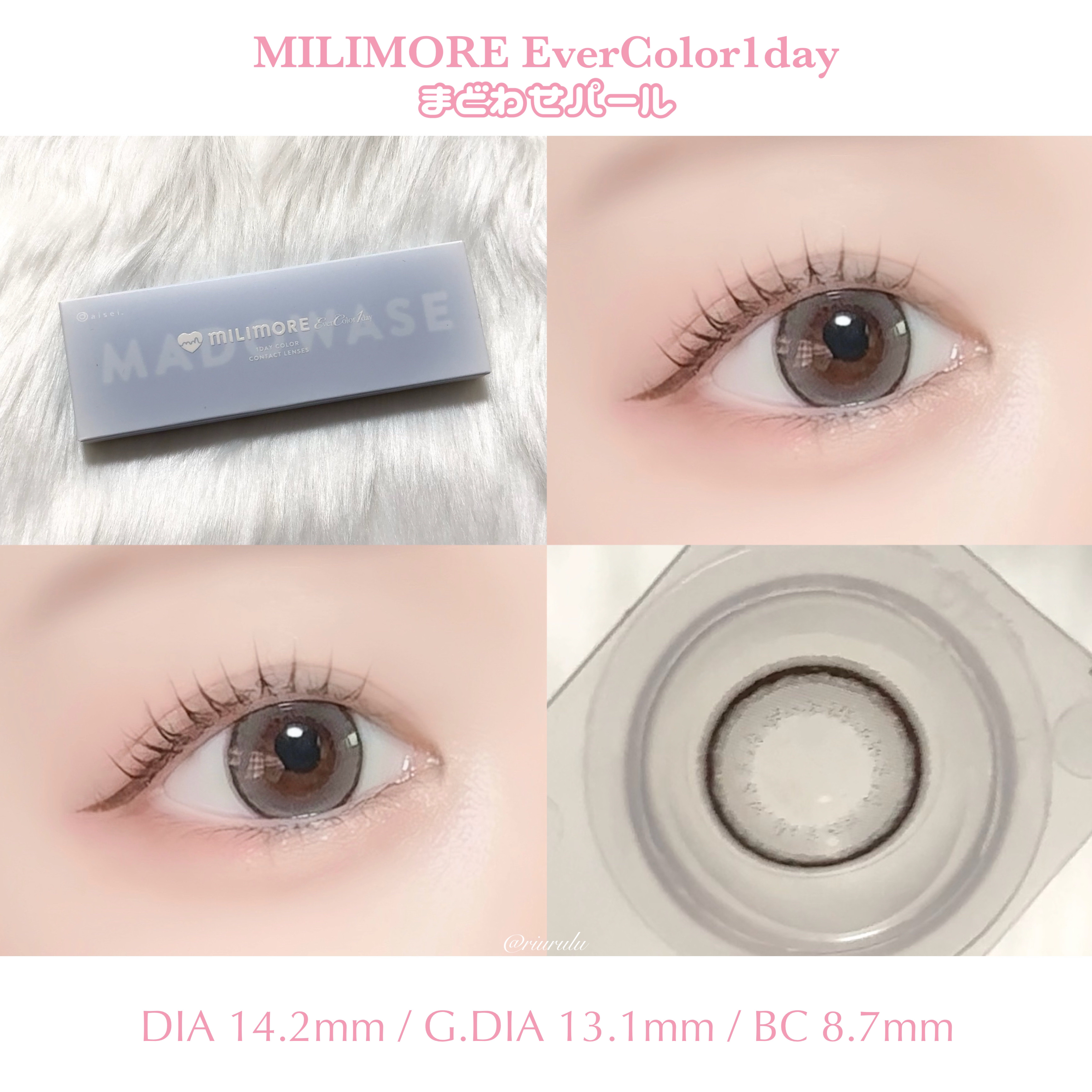 - 【商品特長】 「1mmでももっとかわいくなりたい」 エバーカラーワンデーシリーズ定番商品では初となるDIA14.2mm。 かわいさと着け心地の良さにこだわった、あざと可愛く盛れるラインナップ。 【製品スペック】 □販売名:ミリモア □装用期間:1日使い捨てタイプ □入数:1箱 10枚入 □BC:8.7mm □DIA:14.2mm □含水率:60.0% □中心厚:0.08mm(-3.00Dの場合) □PWR:±0.00( 度なし )/-0.50~-5.00( -0.25Step )/-5.50~-8.00( -0.50Step ) □承認番号:30200BZX00014A04 □製造販売元:株式会社アイレ □販売元:株式会社アイセイ カラーコンタクトレンズの不適正使用による眼障害の危険性等などがあります。 ●コンタクトレンズは高度管理医療機器です。不十分な洗浄・消毒など不適切なケアや、長時間・交換期間を超えた装用により、アレルギー性結膜炎、角膜感染症、角膜潰瘍等の重篤な眼障害が発生する危険性があります ●ご使用前に取扱説明書を確認してください 使用上の留意事項 ●眼科医院等を受診してからお求めください ●眼に異常を感じたら直ちにレンズ使用を中止し、お近くの眼科等で診察を受けてください ●医師の指示にしたがってご使用ください ●コンタクトレンズを装用する場合、自覚症状がなくても、眼科医院等での定期検査を受けてください ●レンズに不具合がある場合は使用しないでください