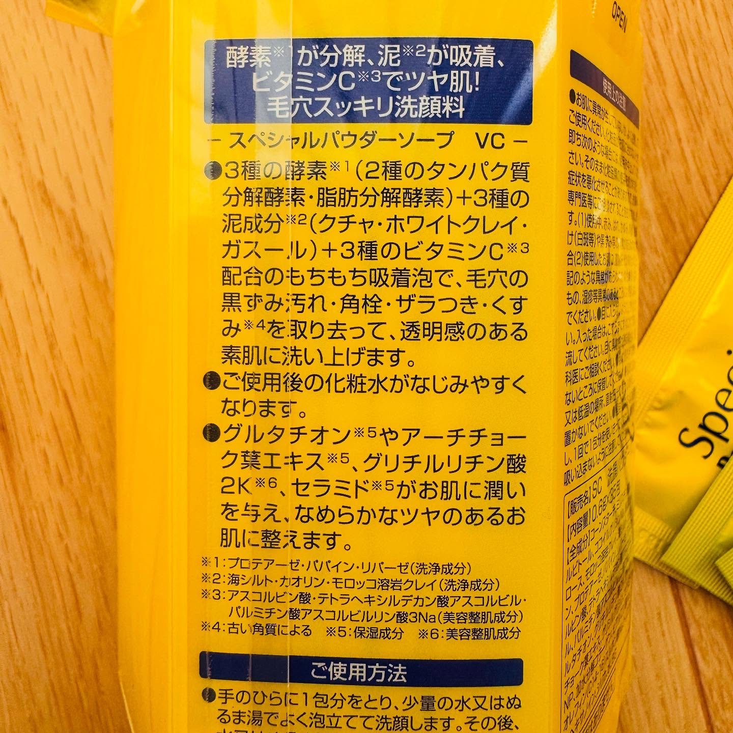 酵素洗顔パウダー「スペシャルパウダーソープVC」3つの酵素*¹、3種泥成分*²、3種ビタミンC*³+グルタチオン*⁴で毛穴つるん1回使いっきりで個包装だから持ち運びも楽ちん泡立ちも良くって、きめ細やかな泡ですもちもち吸着泡で毛穴の汚れやざらつ...