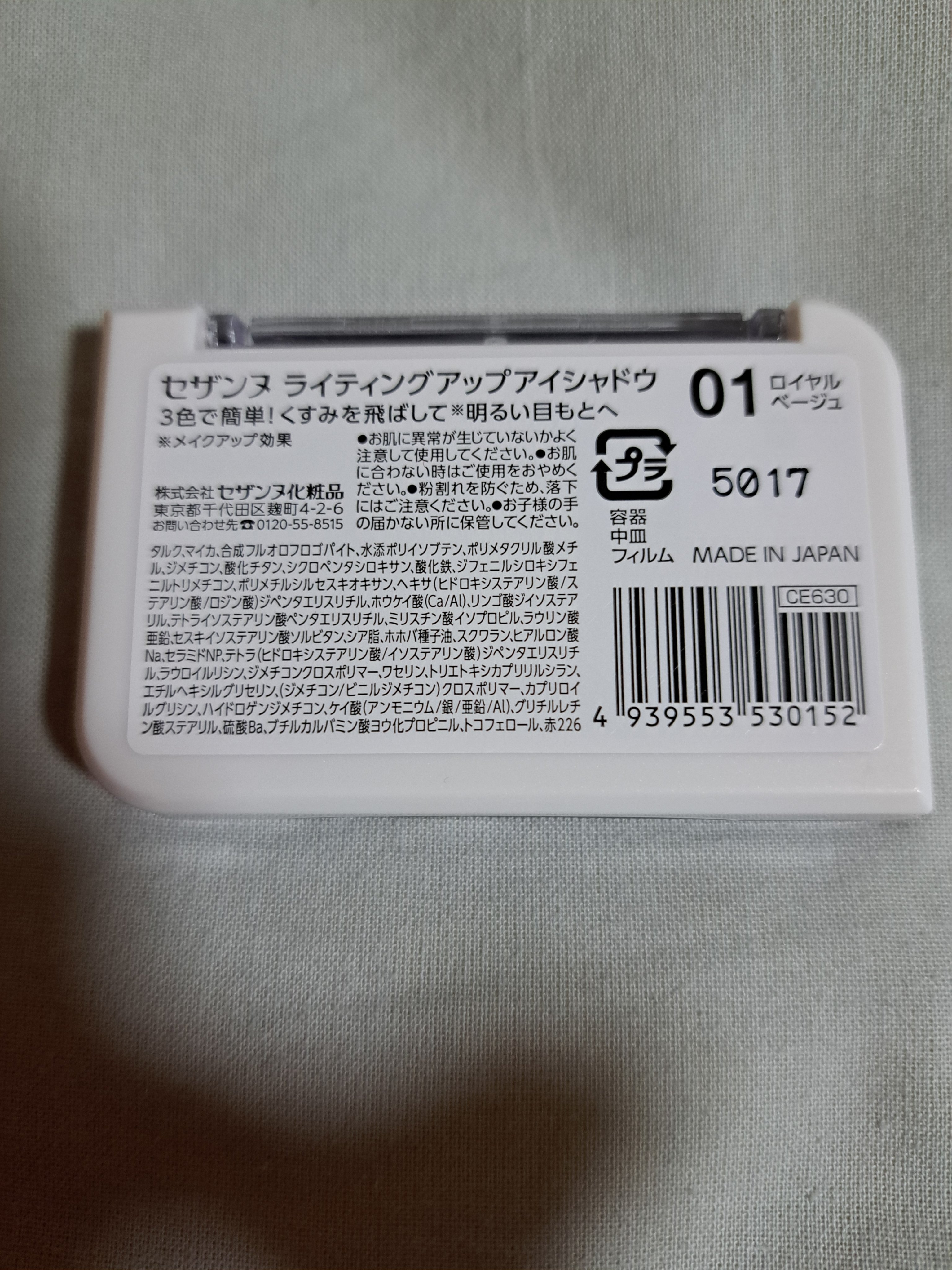 - <01 ロイヤルベージュ> タルク、マイカ、合成フルオロフロゴパイト、水添ポリイソブテン、ポリメタクリル酸メチル、ジメチコン、酸化チタン、シクロペンタシロキサン、酸化鉄、ジフェニルシロキシフェニルトリメチコン、ポリメチルシルセスキオキサン、ヘキサ(ヒドロキシステアリン酸/ステアリン酸/ロジン酸)ジペンタエリスリチル、ホウケイ酸(Ca/Al)、リンゴ酸ジイソステアリル、テトライソステアリン酸ペンタエリスリチル、ミリスチン酸イソプロピル、ラウリン酸亜鉛、セスキイソステアリン酸ソルビタン、シア脂、ホホバ種子油、スクワラン、ヒアルロン酸Na、セラミドNP、テトラ(ヒドロキシステアリン酸/イソステアリン酸)ジペンタエリスリチル、ラウロイルリシン、ジメチコンクロスポリマー、ワセリン、トリエトキシカプリリルシラン、エチルヘキシルグリセリン、(ジメチコン/ビニルジメチコン)クロスポリマー、カプリロイルグリシン、ハイドロゲンジメチコン、ケイ酸(アンモニウム/銀/亜鉛/Al)、グリチルレチン酸ステアリル、硫酸Ba、ブチルカルバミン酸ヨウ化プロピニル、トコフェロール、赤226 <02 ペタルピンク> タルク、マイカ、合成フルオロフロゴパイト、酸化チタン、水添ポリイソブテン、ジメチコン、シクロペンタシロキサン、ポリメタクリル酸メチル、ジフェニルシロキシフェニルトリメチコン、ポリメチルシルセスキオキサン、リンゴ酸ジイソステアリル、ヘキサ(ヒドロキシステアリン酸/ステアリン酸/ロジン酸)ジペンタエリスリチル、酸化鉄、グンジョウ、テトライソステアリン酸ペンタエリスリチル、ミリスチン酸イソプロピル、ラウリン酸亜鉛、セスキイソステアリン酸ソルビタン、シア脂、ホホバ種子油、スクワラン、ヒアルロン酸Na、セラミドNP、テトラ(ヒドロキシステアリン酸/イソステアリン酸)ジペンタエリスリチル、ラウロイルリシン、ジメチコンクロスポリマー、ワセリン、トリエトキシカプリリルシラン、エチルヘキシルグリセリン、(ジメチコン/ビニルジメチコン)クロスポリマー、シリカ、カプリロイルグリシン、ハイドロゲンジメチコン、ケイ酸(アンモニウム/銀/亜鉛/Al)、グリチルレチン酸ステアリル、硫酸Ba、ブチルカルバミン酸ヨウ化プロピニル、トコフェロール、赤202、赤226