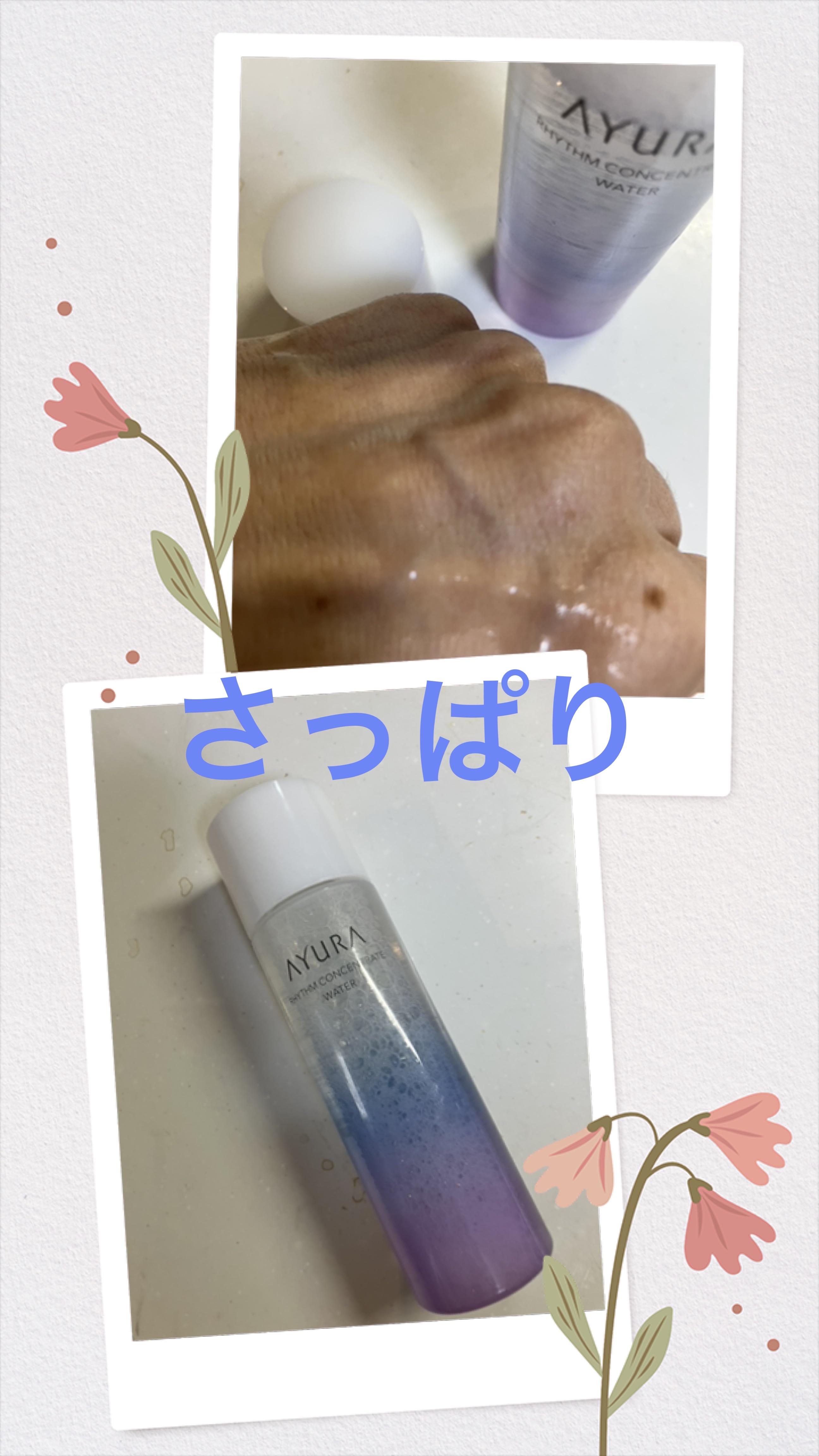 AYURA(アユーラ) リズムコンセントレート。フローラル系の香りなのですが少し生花っぽさもある香りです。白っぽくてとろみのある柔らかなテクスチャーです。肌になめらかに伸ばしやすく肌馴染みもよくて少量で済みます。肌がもちもちしてしっとりした感...