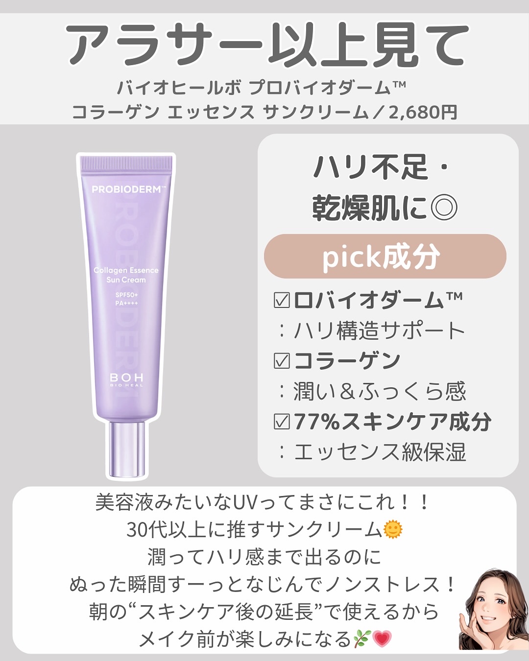 | 日焼け止めクリームランキング第89位 | なめらかなテクスチャーで、ほんのり血色感がでる可愛らしいカラー🩷 しっとりツヤツヤだけどベタつかずにサラッとする! | 詳細を見る |