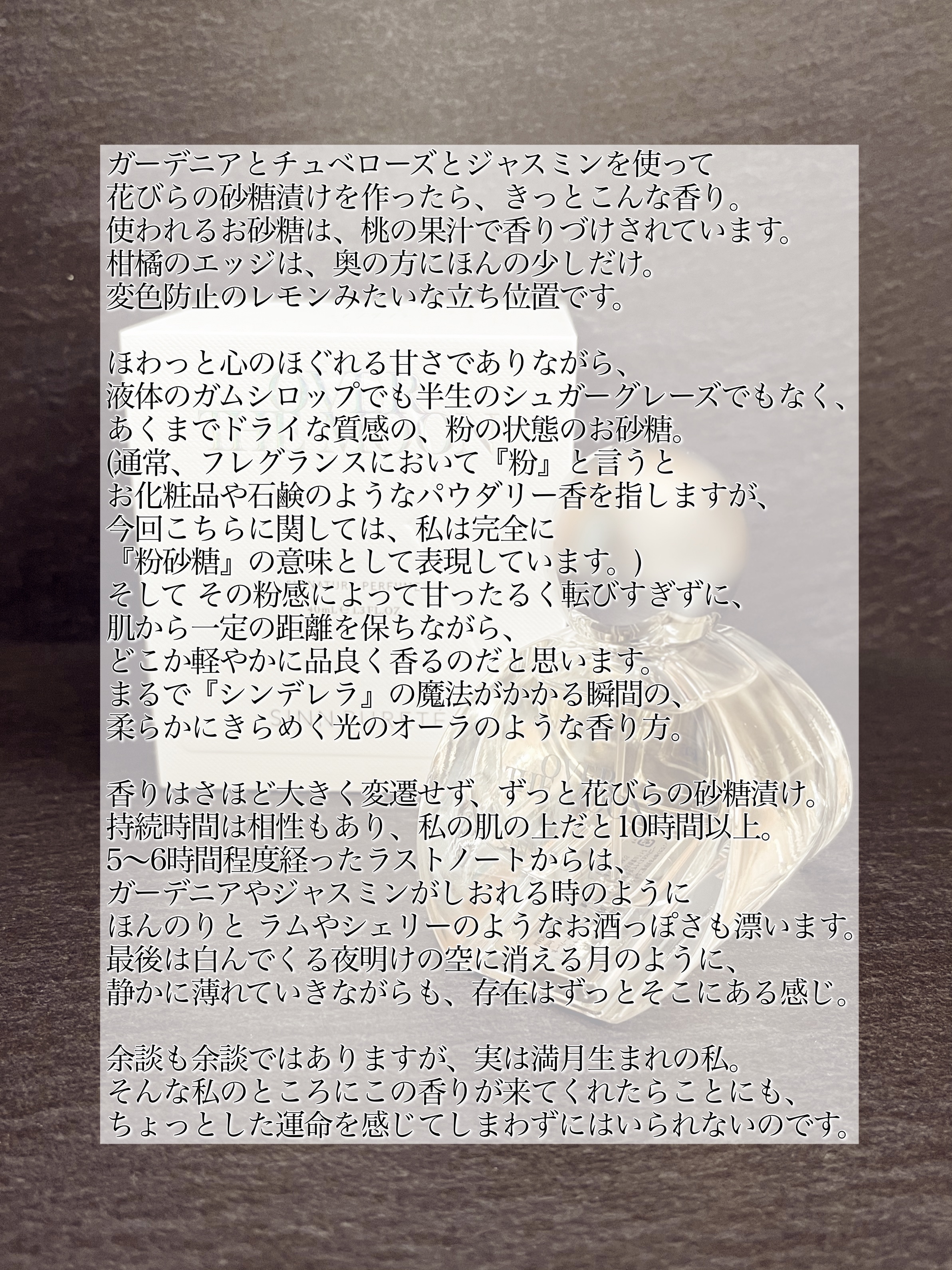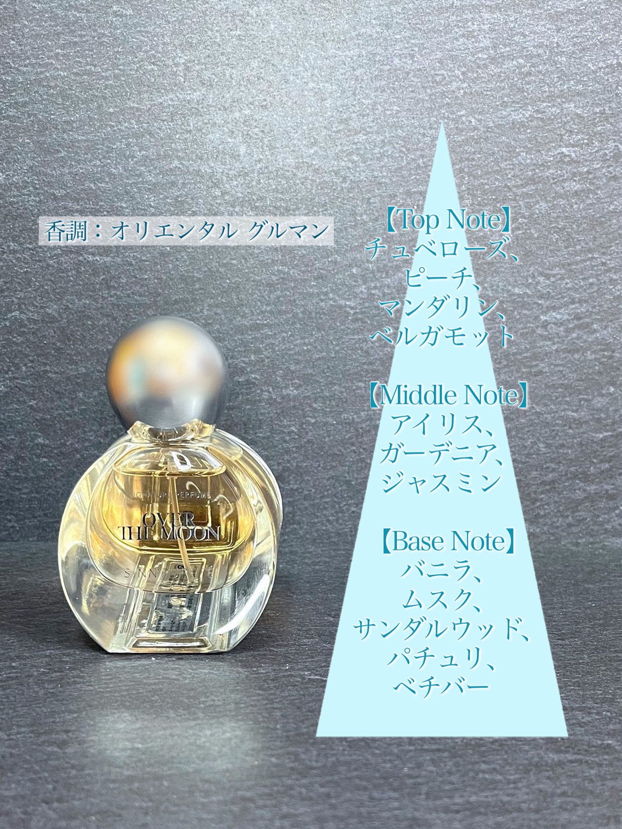 - OVER THE MOON(オーバーザムーン) 月を超えるくらい甘く幸せな状態 Top: Tuberose, Peach, Mandarin, Bergamot Middle: Iris, Gardenia, Jasmine Base: Vanilla, Musk, Sandalwood, Patchouli, Vetiver Concept:月明かりの下で、一緒に過ごした美しい日々について語り合うひととき。 “Be over the moon”それは、月を超えてしまうほどの幸せを感じている瞬間。甘く麗しい、奥ゆかしい愛の表現からインスパイアされた香り。 香りの説明:嗅いだ瞬間に表情がやわらぐ、中毒性のある甘い関係を表現。 愛しい人と月夜に語らう、ともに過ごした美しい日々。思わず表情がやわらぐ甘美な時間のように、華やかなチューベローズとピーチやバニラのまったりとした甘さまとわりつく、中毒性のあるフローラルオリエンタル調の香り。「月が綺麗ですね」という言葉の奥に、秘かな愛を込めて。