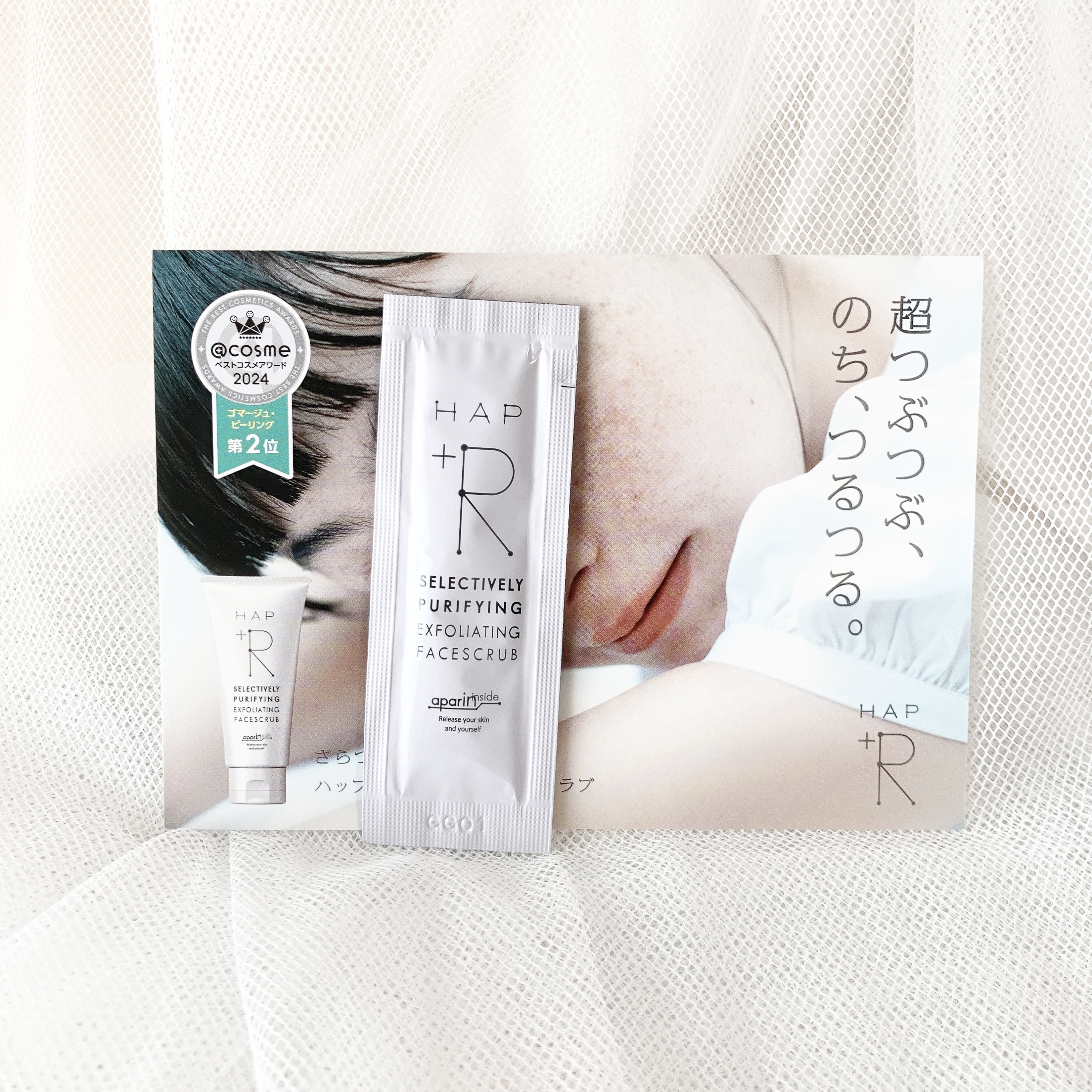 ハップアールはSNSでよく見かけて気になってたのー♡ 今なら2025年1月15日まで「洗顔用吸水リストバンド」が必ずもらえるキャンペーンを実施しているからチェックしてみてね♡ ベストゴマージュ・ピーリング部門第2位に選ばれたアイテムスキンケア用アパタイトをスクラブ粒子化し、たっぷりと配合 結構しっかりしたスクラブなのー。このツブツブ感が気持ちよくて好き♡ハマる♡ パパインとリパーゼの2種の酵素を配合。スキンケア用アパタイトと酵素がWで毛穴汚れにアプローチ♩ 泡立ちが良くてもこもこ♡