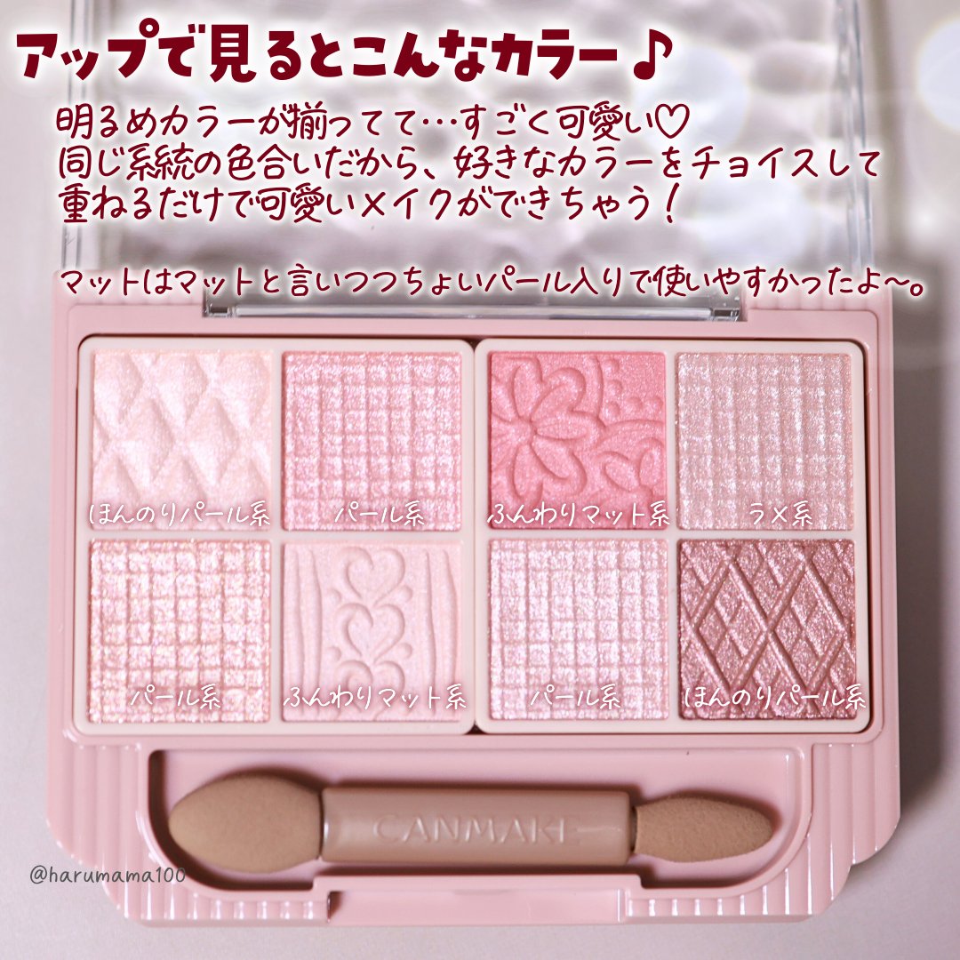 - 持ち歩ける多色パレットがキャンメイクから登場! 捨て色なしの8色入り&チップ付! 「持ち歩けること」や「外出先でもメイク直しができること」を重視した多色パレット。 持ち運びやすいサイズ感なのに、贅沢に8色入りです。 さらに便利なダブルエンドチップまで! マット×パール×ラメなど、組み合わせ方はあなたの自由! 自分好みのアイメイクを楽しめます。