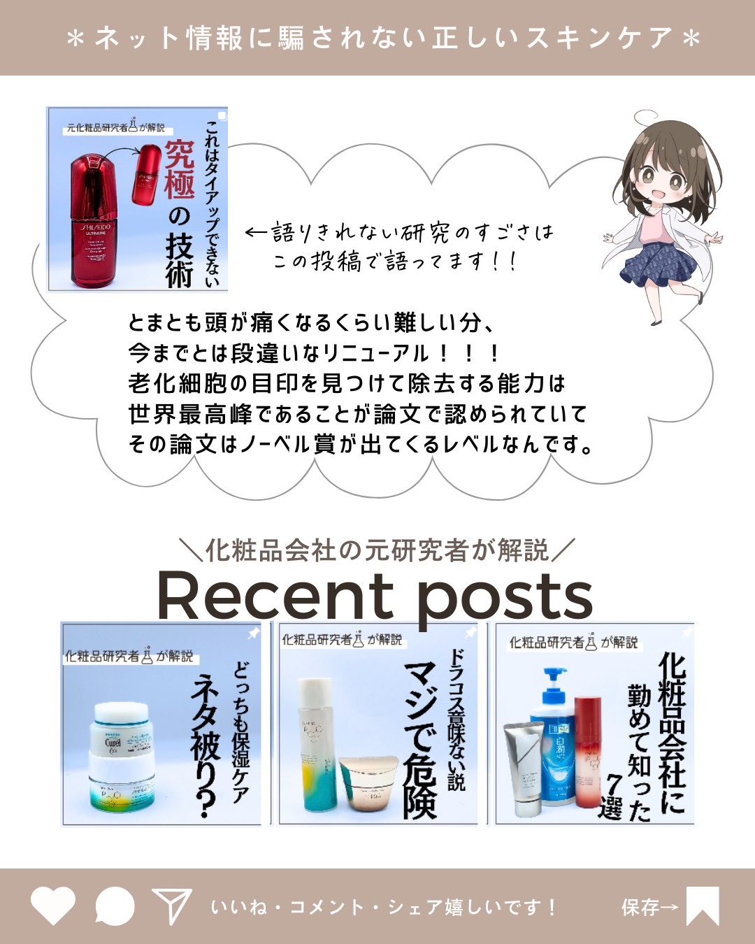 特定の有効成分を試してみたい。美容成分を試したい。そんな時は代用してもいいけど、それって似てるのかな?って思うときが正直ある。 同じ成分があっても実は濃度が違ったり、処方技術が違ったり。技術が違うと使用感も剤型も変わることがあることは知ったうえで使うといいかも。 せっかくプチプラ化粧品を買うならそれはそれで楽しんでほしいから是非念頭にいれてほしいな!!