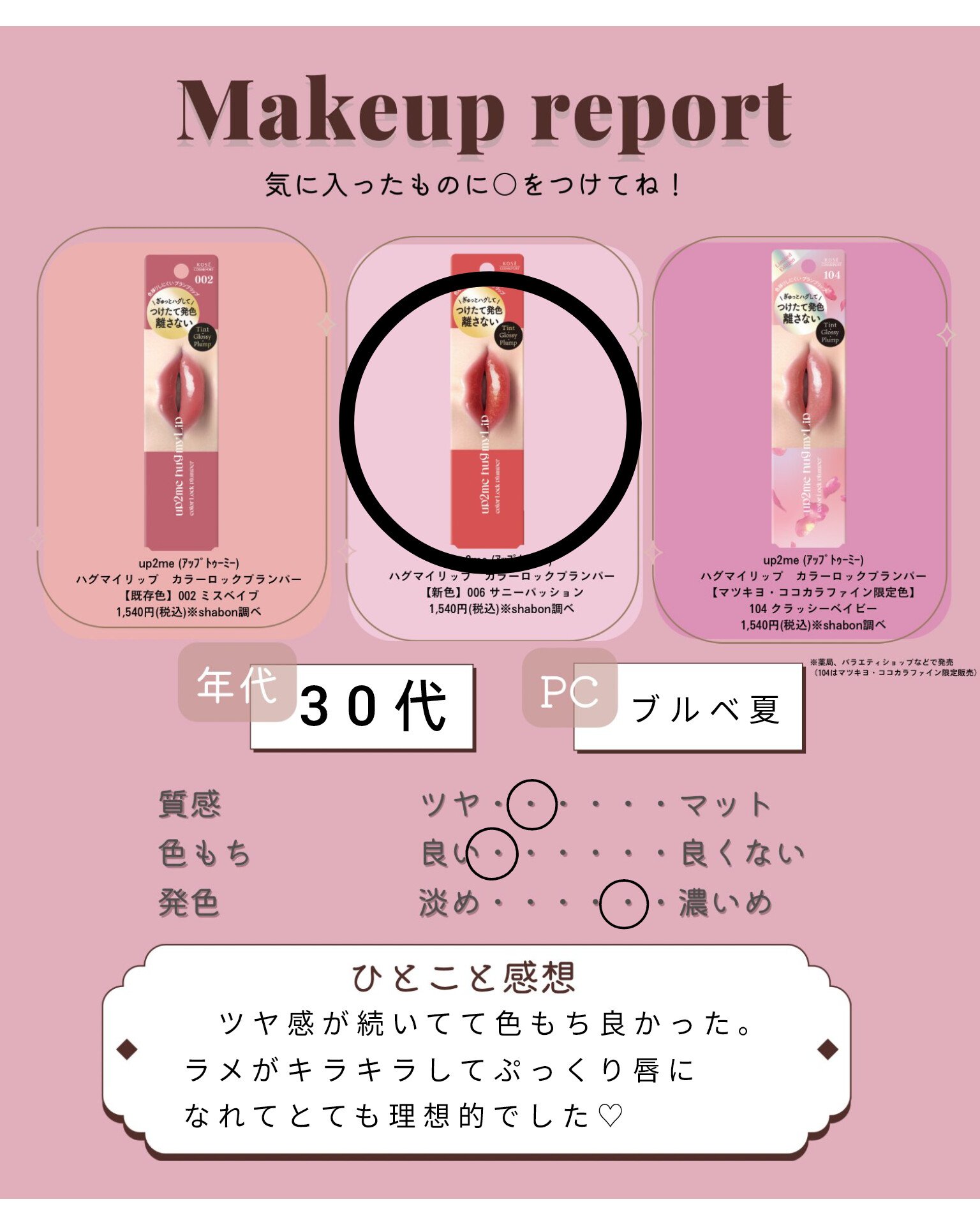 up2me×shabon商品提供いただきましたハグマイリップ カラーロックプランパー002ミスベイブ006サニーパッション(NEW)104クラッシーベイビー(マツキヨ・ココカラファイン限定)#PR@shabon_official@koseco...