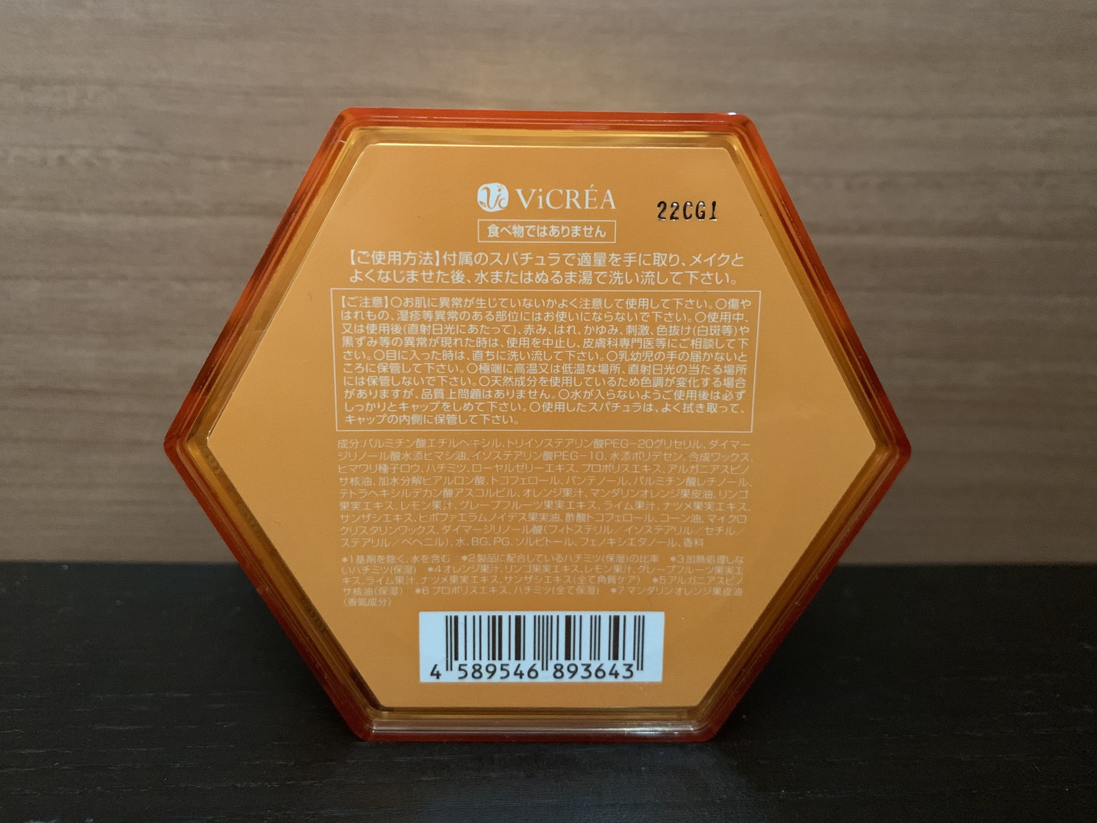 - <オレンジ> パルミチン酸エチルヘキシル、トリイソステアリン酸PEG-20グリセリル、ダイマージリノール酸水添ヒマシ油、イソステアリン酸PEG-10、水添ポリデセン、合成ワックス、ヒマワリ種子ロウ、ハチミツ、ローヤルゼリーエキス、プロポリスエキス、アルガニアスピノサ核油、加水分解ヒアルロン酸、トコフェロール、パンテノール、パルミチン酸レチノール、テトラヘキシルデカン酸アスコルビル、オレンジ果汁、マンダリンオレンジ果皮油、リンゴ果実エキス、レモン果汁、グレープフルーツ果実エキス、ライム果汁、ナツメ果実エキス、サンザシエキス、ヒポファエラムノイデス果実油、酢酸トコフェロール、コーン油、マイクロクリスタリンワックス、ダイマージリノール酸(フィトステリル/イソステアリル/セチル/ステアリル/ベヘニル)、水、BG、PG、ソルビトール、フェノキシエタノール、香料 <ミニサイズ20g> パルミチン酸エチルヘキシル、トリイソステアリン酸PEG-20グリセリル、ダイマージリノール酸水添ヒマシ油、イソステアリン酸PEG-10、水添ポリデセン、合成ワックス、ヒマワリ種子ロウ、ハチミツ、ローヤルゼリーエキス、プロポリスエキス、アルガニアスピノサ核油、加水分解ヒアルロン酸、トコフェロール、パンテノール、パルミチン酸レチノール、テトラヘキシルデカン酸アスコルビル、オレンジ果汁、マンダリンオレンジ果皮油、リンゴ果実エキス、レモン果汁、グレープフルーツ果実エキス、ライム果汁、ナツメ果実エキス、サンザシエキス、ヒポファエラムノイデス果実油、酢酸トコフェロール、コーン油、マイクロクリスタリンワックス、ダイマージリノール酸(フィトステリル/イソステアリル/セチル/ステアリル/ベヘニル)、水、BG、PG、ソルビトール、フェノキシエタノール、香料 <90g> パルミチン酸エチルヘキシル、トリイソステアリン酸PEG-20グリセリル、ダイマージリノール酸水添ヒマシ油、イソステアリン酸PEG-10、水添ポリデセン、合成ワックス、ヒマワリ種子ロウ、ハチミツ、ローヤルゼリーエキス、プロポリスエキス、アルガニアスピノサ核油、加水分解ヒアルロン酸、トコフェロール、パンテノール、パルミチン酸レチノール、テトラヘキシルデカン酸アスコルビル、オレンジ果汁、マンダリンオレンジ果皮油、リンゴ果実エキス、レモン果汁、グレープフルーツ果実エキス、ライム果汁、ナツメ果実エキス、サンザシエキス、ヒポファエラムノイデス果実油、酢酸トコフェロール、コーン油、マイクロクリスタリンワックス、ダイマージリノール酸(フィトステリル/イソステアリル/セチル/ステアリル/ベヘニル)、水、BG、PG、ソルビトール、フェノキシエタノール、香料 <増量120g> パルミチン酸エチルヘキシル、トリイソステアリン酸PEG-20グリセリル、ダイマージリノール酸水添ヒマシ油、イソステアリン酸PEG-10、水添ポリデセン、合成ワックス、ヒマワリ種子ロウ、ハチミツ、ローヤルゼリーエキス、プロポリスエキス、アルガニアスピノサ核油、加水分解ヒアルロン酸、トコフェロール、パンテノール、パルミチン酸レチノール、テトラヘキシルデカン酸アスコルビル、オレンジ果汁、マンダリンオレンジ果皮油、リンゴ果実エキス、レモン果汁、グレープフルーツ果実エキス、ライム果汁、ナツメ果実エキス、サンザシエキス、ヒポファエラムノイデス果実油、酢酸トコフェロール、コーン油、マイクロクリスタリンワックス、ダイマージリノール酸(フィトステリル/イソステアリル/セチル/ステアリル/ベヘニル)、水、BG、PG、ソルビトール、フェノキシエタノール、香料