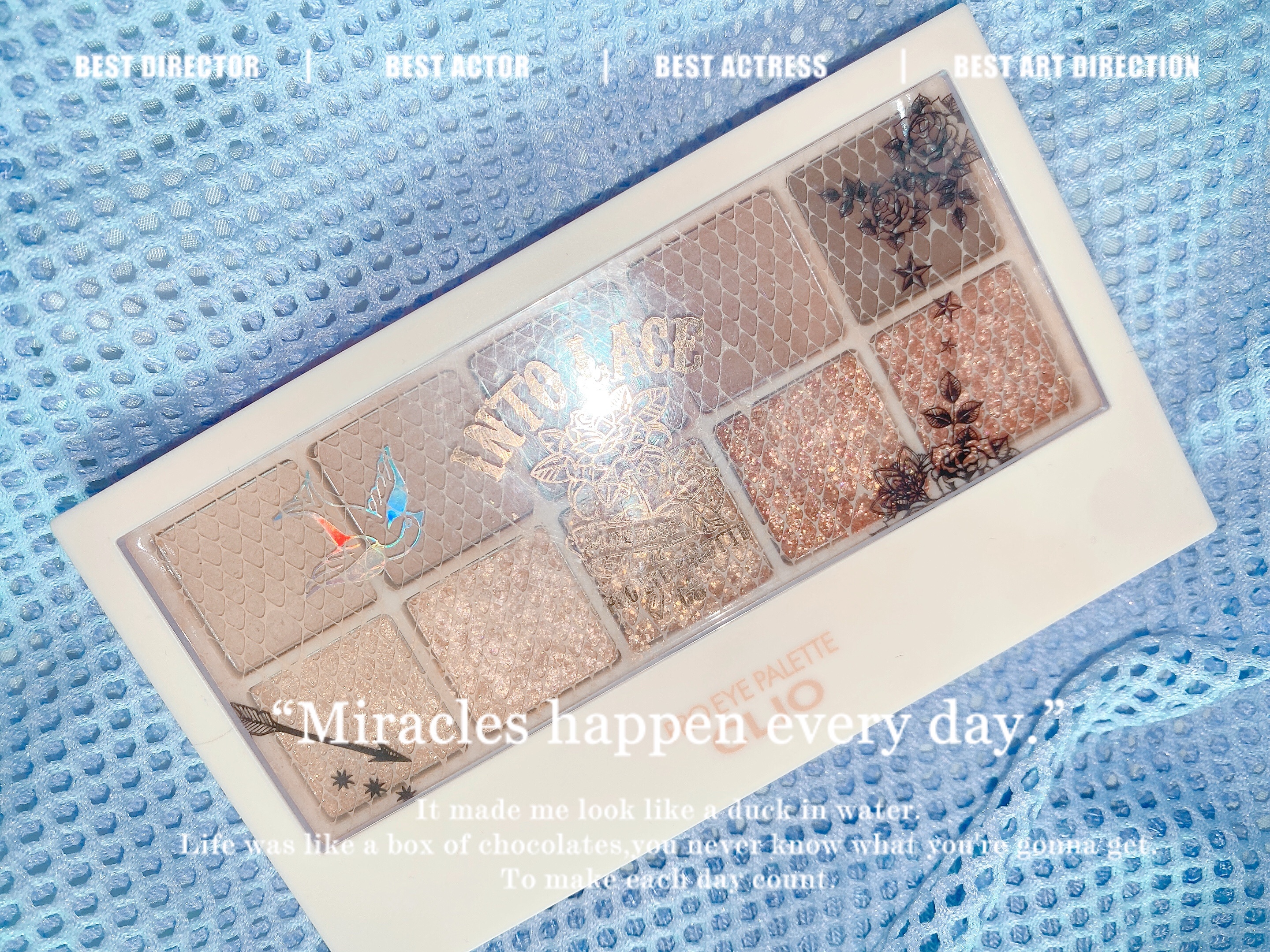 - ひとつのパレットにマット、シマー、グリッターなど多様な質感を贅沢に使用。塗る順序やカラーの組み合わせを変えるだけでデイリーメイクにも、特別な日のお出かけメイクにもできる優れもの。また粉飛びせず、まぶたにしっかり密着します。
