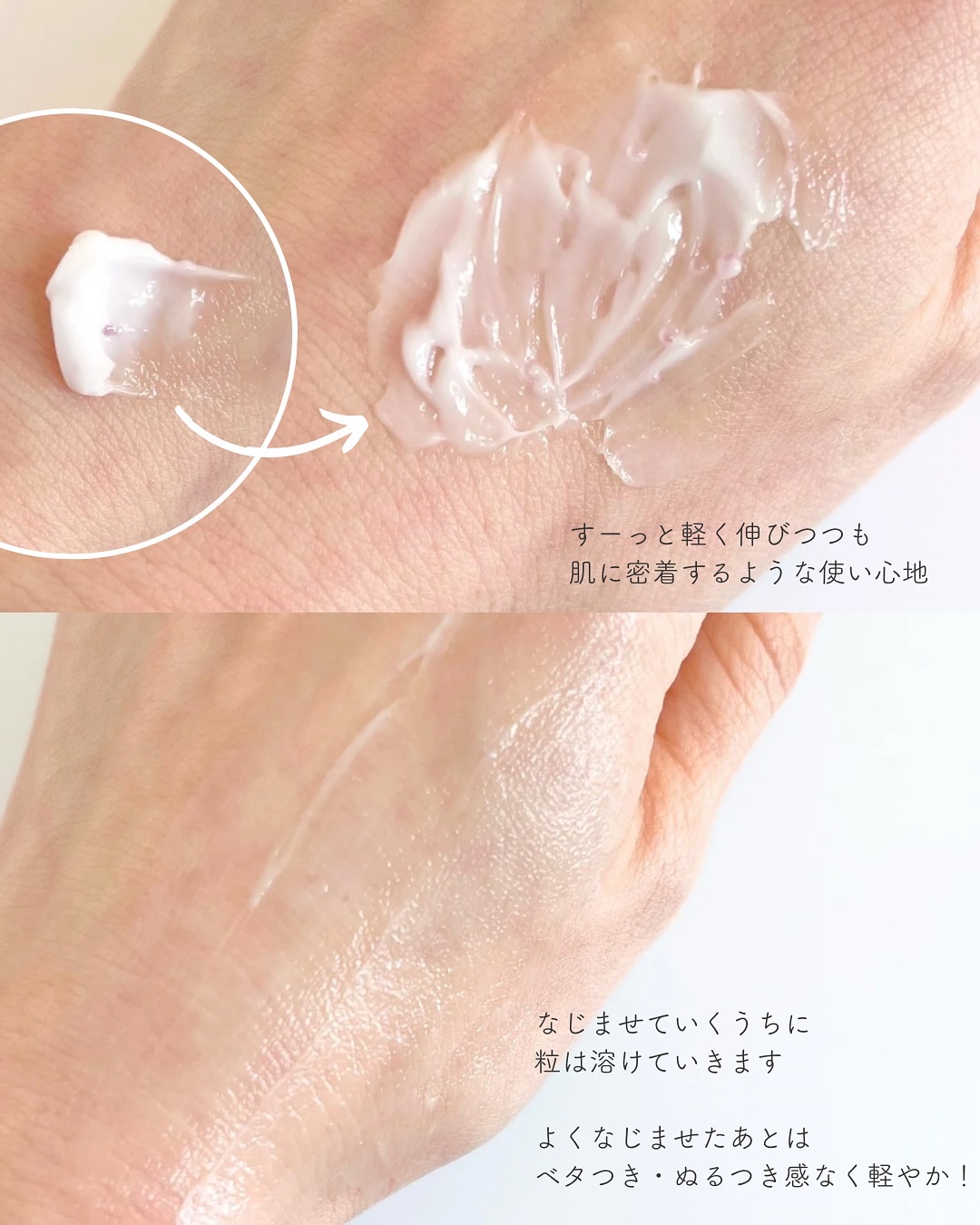 ベージュの方がなじみがよく、肌から浮く感じは皆無で自然にトーンアップできます。 すごく軽い使い心地ですが、なじみのいいカラーのおかげでより毛穴や色むらなどのアラをきれいにカバーできるように感じました。 ラベンダーは、肌の黄み感がかなり抑えられる印象! 透明感を求めるなら圧倒的にこちらで、色白に見えるように感じました。 黄みをカバーできるおかげで、苦手な青みピンクのリップやチークが似合う肌になれたので、ブルベメイクもしたいイエベさんにはラベンダーがおすすめです✨