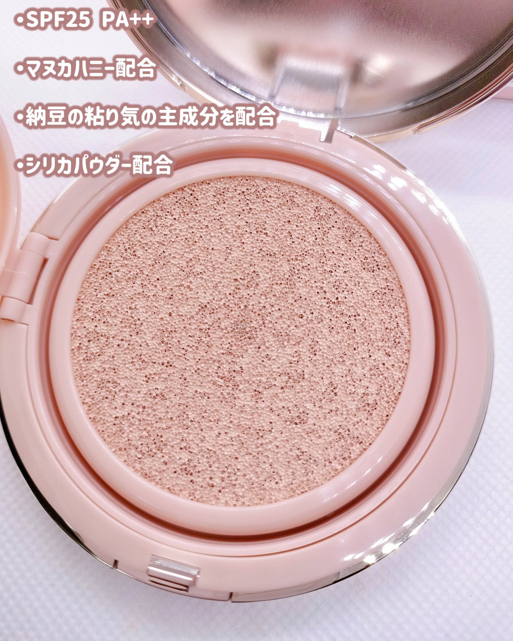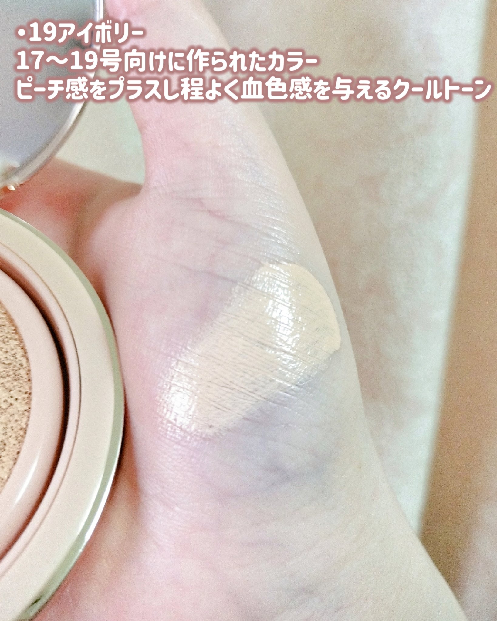軽い付け心地なのに陶器肌のようなお肌を演出してくれる高カバーセミマットテクスチャー💗 シリカパウダー配合で表面をなめらかに、付けたてからお肌にフィットする高密着クッション𓈒𓋜SPF25・PA++!☀️ パッケージもピンク×ゴールドが上品でかわいい!¨♡¨カラーは3色展開(19・21・23)で19アイボリーはピーチ感をプラスして血色感を与える、クールトーンでお肌をナチュラルに明るく見せてくれるようなお色がかわいい𓂃🎀𓈒𓏸 セミマットでしっとり密着してカバー力もよく、お肌が綺麗に見えてお気に入り`🤍´