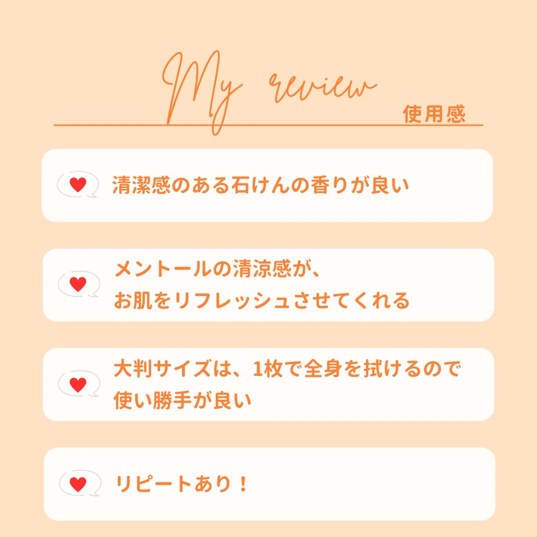 | ボディシートランキング第5位 | かなりヒンヤリとしています😊甘い香りがついているわけではないので、男女問わず使えるのはいいなぁと思います✨ | 詳細を見る | |