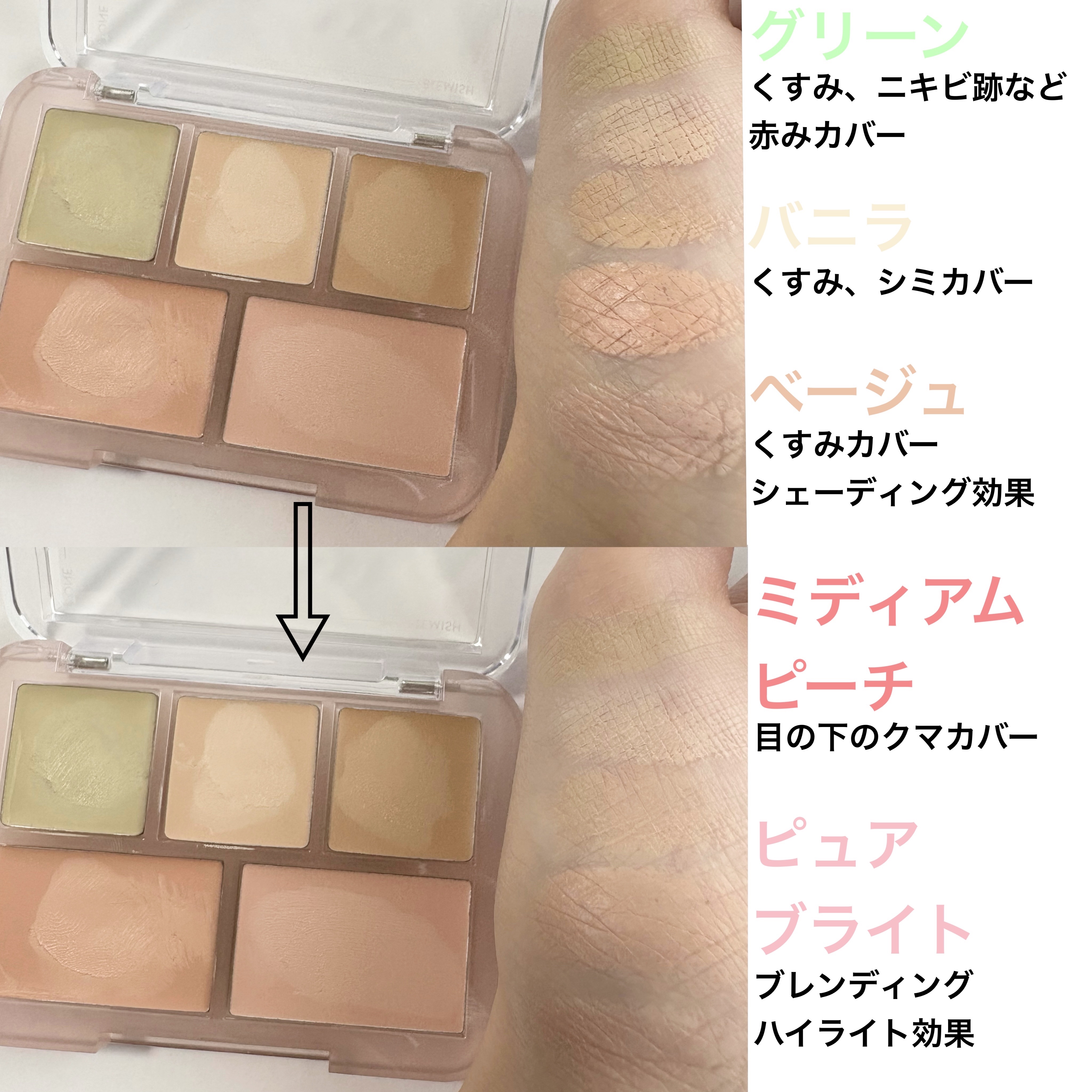 パレットひとつでカバーからカラーコントロールまで叶う、絶妙な色合いで素肌感メイク 手の温度でじゅわっと溶ける、クリーミーなテクスチャ☝🏻 ͗ ͗パサつかず、油分も多すぎることなく、肌なじみのいいコンシーラー🤍 中でもビュアブライトが特にお気に入り♡ハイライト代わりに重宝してるし、涙袋に使うのめっちゃ良い🥹盛れる🥹🤍🤍
