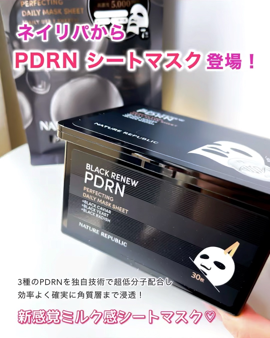 - ネイチャーリパブリックの韓国肌管理*1ラインより〈エイジングケア*2&お肌の生まれ変わりのリズムに寄りそう*3〉プレミアムシートマスクが誕生! 韓国の肌管理*1を由来とする美容成分「PDRN」に注目が集まっている中、ネイチャーリパブリックでは3種の“黒”にまつわる素材から抽出したPDRN配合のシートマスクを開発しました。 キャビア(動物由来)+黒大根(植物由来)+黒酵母(菌由来)から抽出したネイチャーリパブリック独自の超低分子PDRN Complex*を5,000ppm配合した今までにないリッチな使用感のデイリーシートマスクです。 なお、発売に先立ち2025年4月19日(土)よりロフト、ロフトネットストア※、公式オンラインストア、Qoo10、で先行発売いたします。 ※順次発売予定のため、店舗によってお取り扱い状況が異なる場合がございます。 ※一部取り扱いのない店舗がございます。 *PDRN Complex=DNA-Na:キャビア/キャビアエキス、黒酵母/酵母エキス、黒大根/ダイコン根エキスから抽出(整肌成分)、*1うるおいケアのこと *2年齢に応じたうるおいケアのこと、*3お肌を整えるスキンケアのこと