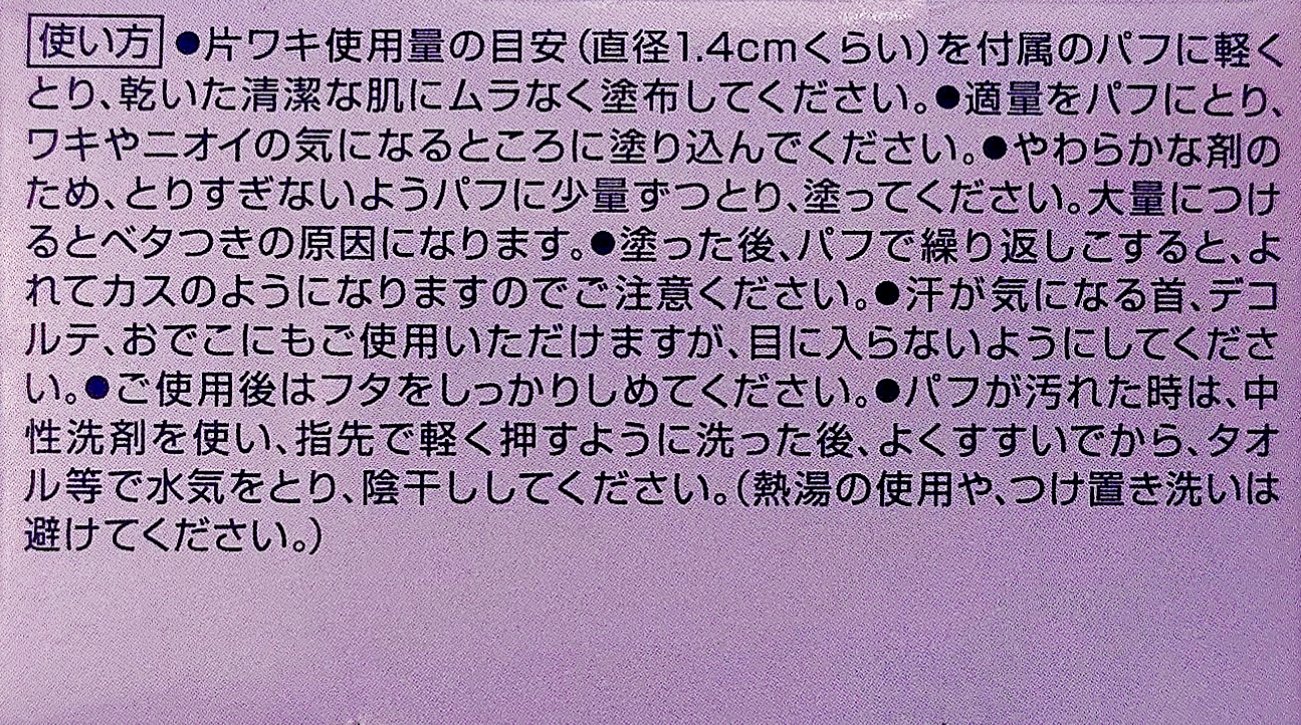 - 【医薬部外品】 パフで塗り込む制汗パテ 一日ずっと汗・ニオイを防ぐ ●パフで毛穴まで塗り込む制汗パテ ●クッションパフ+柔らかパテで毛穴まで入り込んでピタッと密着 ●するっ!としたら塗り込めたサイン! ●汗のニオイの元となるニオイ菌を殺菌して1日ずっと汗・ニオわせない。 ●汗が気になる時でも1日ずっとさらさら*1持続 ・制汗成分:焼ミョウバン*2配合 ・殺菌成分:イソプロピルメチルフェノール配合 ・高吸汗・高吸湿ドライパウダー配合(基剤) ○無香性 ○両脇塗布で約100回分(使用量の目安:片わき直径1.4cm) ○パフ1枚入り *1 高吸汗・高吸湿ドライパウダー(基剤)配合 *2 乾燥硫酸アルミニウムカリウム 効能効果:わきが(腋臭)、皮ふ汗臭、制汗