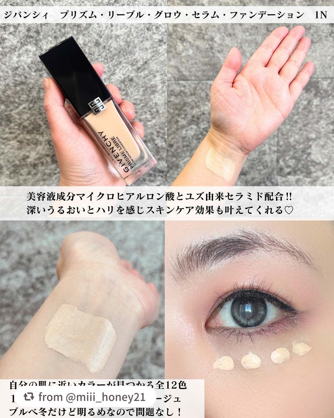 - 光透明感を叶える美容液ファンデーション ジバンシイを代表する製品である「プリズム・リーブル」に着想を得たプリズム・ブレンド処方が、気になる肌悩みを1日中ぼかしながら、 みずみずしいうるおいと透明感に包まれた自然なセミツヤ肌を演出。 角層まで届くマイクロヒアルロン酸*1とユズ由来セラミド*2によって長時間うるおいとツヤあふれる“ロングラスティング・スキンケアリング効果”を実現。 いつでも「プリズム」のような光透明感のある肌を叶える、新世代美容液ファンデーションです。 *1:ヒアルロン酸(保湿成分)*2:ユズ果実エキス(保湿成分)