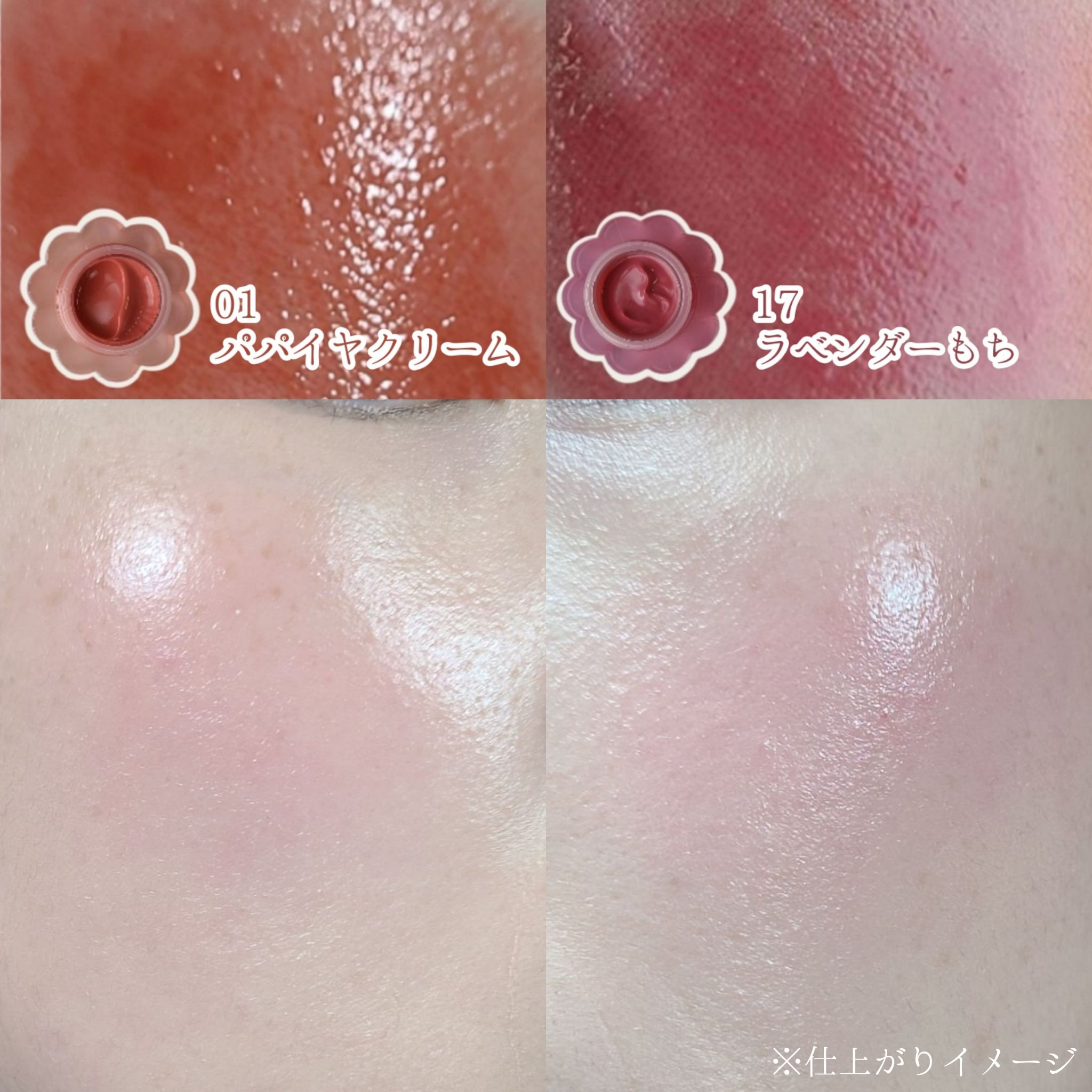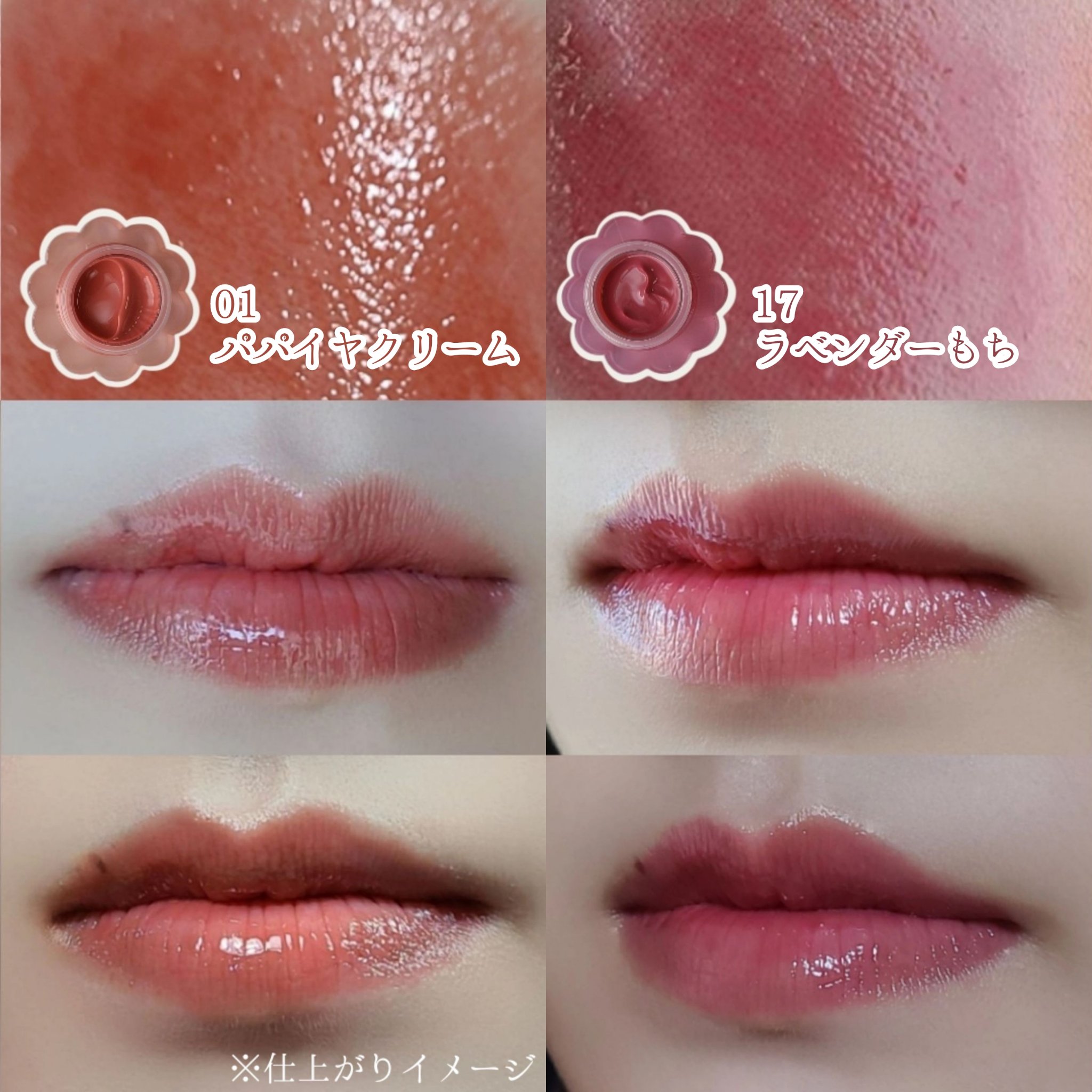 - <01 パパイヤクリーム> 水、ヘキサ(ヒドロキシステアリン酸/ステアリン酸/ロジン酸)ジペンタエリスリチル、トリエチルヘキサノイン、BG、グリセリン、オクチルドデカノール、ポリソルベート60、プロパンジオール、(PEG-240/デシルテトラデセス-20/HDI)コポリマー、1,2-ヘキサンジオール、セテアレス-20、フェノキシエタノール、エチルセルロース、カプリル酸グリセリル、(アクリル酸ヒドロキシエチル/アクリロイルジメチルタウリンNa)コポリマー、トリイソステアリン酸ポリグリセリル-2、リンゴ酸ジイソステアリル、酸化チタン、スクワラン、(アクリレーツ/アクリル酸アルキル(C10-30))クロスポリマー、トロメタミン、香料、エチルヘキシルグリセリン、黄4、赤104(1)、黄5、赤227、エチレンジアミンジコハク酸3Na、イソステアリン酸ソルビタン、ジイソステアリン酸ポリグリセリル-2、リナロール、ラウリン酸K、トコフェロール、青1 <02 ピーチドロップ> 水、ヘキサ(ヒドロキシステアリン酸/ステアリン酸/ロジン酸)ジペンタエリスリチル、トリエチルヘキサノイン、BG、グリセリン、オクチルドデカノール、ポリソルベート60、プロパンジオール、(PEG-240/デシルテトラデセス-20/HDI)コポリマー、1,2-ヘキサンジオール、セテアレス-20、フェノキシエタノール、リンゴ酸ジイソステアリル、酸化チタン、エチルセルロース、カプリル酸グリセリル、(アクリル酸ヒドロキシエチル/アクリロイルジメチルタウリンNa)コポリマー、トリイソステアリン酸ポリグリセリル-2、スクワラン、(アクリレーツ/アクリル酸アルキル(C10-30))クロスポリマー、トロメタミン、香料、エチルヘキシルグリセリン、黄5、赤104(1)、赤227、黄4、エチレンジアミンジコハク酸3Na、イソステアリン酸ソルビタン、ジイソステアリン酸ポリグリセリル-2、青1、リナロール、ラウリン酸K、トコフェロール <03 ハニーマンゴ> 水、ヘキサ(ヒドロキシステアリン酸/ステアリン酸/ロジン酸)ジペンタエリスリチル、トリエチルヘキサノイン、BG、グリセリン、オクチドデカノール、ポリソルベート60、プロパンジオール、(PEG-240/デシルテトラデセス-20/HDI)コポリマー、1,2-ヘキサンジオール、セテアレス-20、フェノキシエタノール、エチルセルロース、リンゴ酸ジイソステアリル、カプリル酸グリセリル、酸化チタン、(アクリル酸ヒドロキシエチル/アクリロイルジメチルタウリンNa)コポリマー、トリイソステアリン酸ポリグリセリル-2、スクワラン、(アクリレーツ/アクリル酸アルキル(C10-30))クロスポリマー、トロメタミン、香料、エチルヘキシルグリセリン、赤104(1)、黄5、赤227、黄4、エチレンジアミンジコハク酸3Na、イソステアリン酸ソルビタン、ジイソステアリン酸ポリグリセリル-2、リナロール、ラウリン酸K、トコフェロール、青1 <04 ピンクバブル> 水、ヘキサ(ヒドロキシステアリン酸/ステアリン酸/ロジン酸)ジペンタエリスリチル、トリエチルヘキサノイン、BG、グリセリン、オクチドデカノール、ポリソルベート60、プロパンジオール、(PEG-240/デシルテトラデセス-20/HDI)コポリマー、1,2-ヘキサンジオール、セテアレス-20、フェノキシエタノール、エチルセルロース、カプリル酸グリセリル、トリイソステアリン酸ポリグリセリル-2、(アクリル酸ヒドロキシエチル/アクリロイルジメチルタウリンNa)コポリマー、スクワラン、(アクリレーツ/アクリル酸アルキル(C10-30))クロスポリマー、リンゴ酸ジイソステアリル、酸化チタン、トロメタミン、香料、エチルヘキシルグリセリン、赤104(1)、酸化鉄、赤227、エチレンジアミンジコハク酸3Na、ジイソステアリン酸ポリグリセリル-2、黄4、イソステアリン酸ソルビタン、黄5、リナロール、ラウリン酸K、トコフェロール <05 アップルゼリー> 水、ヘキサ(ヒドロキシステアリン酸/ステアリン酸/ロジン酸)ジペンタエリスリチル、トリエチルヘキサノイン、BG、グリセリン、オクチドデカノール、ポリソルベート60、プロパンジオール、(PEG-240/デシルテトラデセス-20/HDI)コポリマー、1,2-ヘキサンジオール、セテアレス-20、フェノキシエタノール、トリイソステアリン酸ポリグリセリル-2、エチルセルロース、カプリル酸グリセリル、(アクリル酸ヒドロキシエチル/アクリロイルジメチルタウリンNa)コポリマー、スクワラン、(アクリレーツ/アクリル酸アルキル(C10-30))クロスポリマー、トロメタミン、香料、リンゴ酸ジイソステアリル、酸化チタン、エチルヘキシルグリセリン、赤227、黄5、赤104(1)、黄4、エチレンジアミンジコハク酸3Na、ジイソステアリン酸ポリグリセリル-2、イソステアリン酸ソルビタン、リナロール、ラウリン酸K、トコフェロール、青1 <06 クアバキャンディ> 水、ヘキサ(ヒドロキシステアリン酸/ステアリン酸/ロジン酸)ジペンタエリスリチル、トリエチルヘキサノイン、BG、グリセリン、オクチドデカノール、ポリソルベート60、プロパンジオール、(PEG-240/デシルテトラデセス-20/HDI)コポリマー、1,2-ヘキサンジオール、セテアレス-20、フェノ