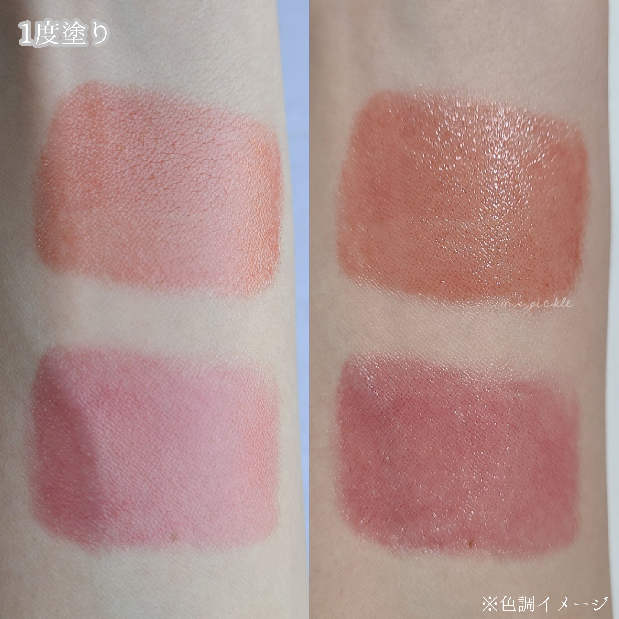 落ち着いたピーチベージュ or ヌーディーオレンジ(オレンジ控えめ)といった感じの、ナチュラルで上品な色です。 手には色味がわかりやすいように指でがっつり塗り重ねました。ブラシで塗るともっと自然です✨ ほのかにツヤ感がありますが、頬に塗ってみるとあまり目立ちません。 チークを塗ったところだけマットになっちゃった💦を防ぐためのツヤなのかな? 「チークはあまり好きじゃないけど、塗らないと顔色が悪く見えちゃう」という方にもオススメしたい色味でした。