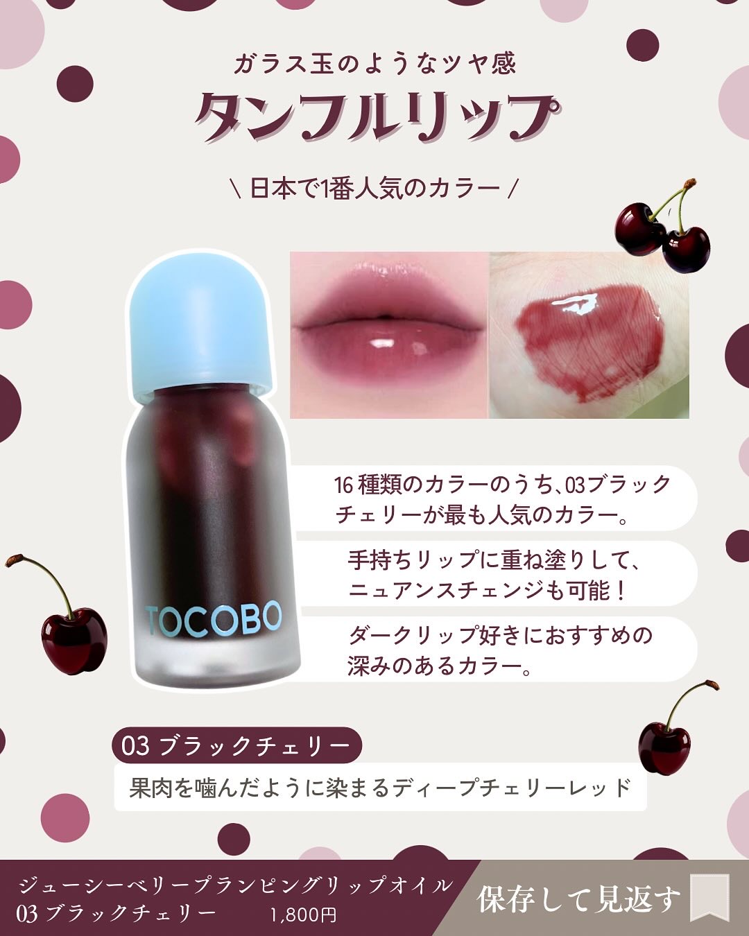 うるツヤ✨️TOCOBOジューシーベリープランピングリップオイル🩷私が使ってるのは03:ブラックチェリーBlackCherryだよ!日本で一番人気のカラーなんだって😘ふっくら効果とツヤオイルベースで、唇にボリュームを出しつつガラス玉のようなツ...