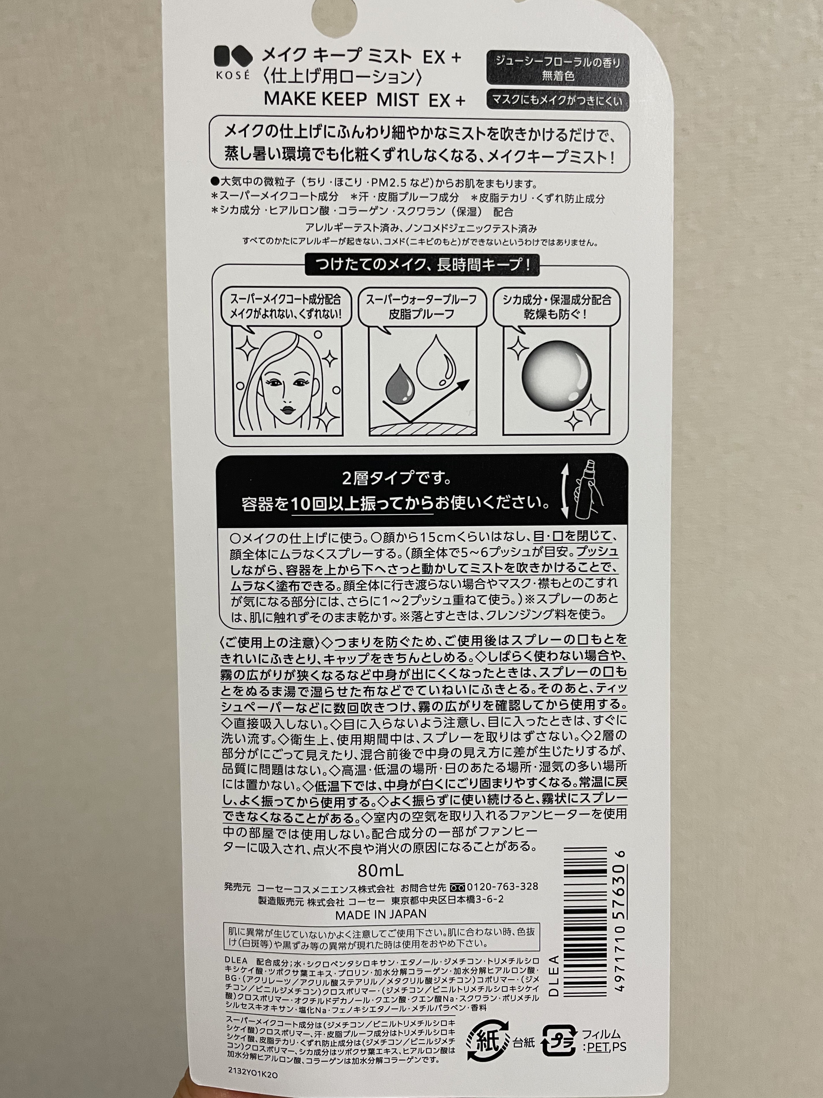 - メイク キープ ミスト EX + 長時間、化粧持ちデータ取得済み! ※当社調べ。個人差があります。 ●メイクの仕上げにシュッと吹きかけるだけで、蒸し暑い環境でも化粧くずれしにくくなるメイクキープミストです。 ●メイクよれ防止効果がプラスとなり、メイクキープ効果が衝撃パワーアップ! コーセーオリジナルの「スーパーメイクコート成分」を新配合。 表情の動きにもよれにくく高い柔軟性をもつため、 表情の変化によるメイクよれを防止。 美しい仕上がりをキープします。 ●スーパーウォータープルーフヘパワーアップ! 汗・水・涙にも強く、撥水効果を発揮します。 撥水性の高い膜が、 隙間なく均一に肌へ密着。 汗・ 水 ・ 涙をしっかりはじき、メイクくずれを防ぎます。 ●高い皮脂プルーフ効果で、 テカリ&毛穴落ち防止効果がパワーアップ! 皮脂テカリ・くずれ防止成分が皮脂をはじくと同時にテカリを防止。 テカリだけでなく、 メイクの毛穴落ちまで防ぎます。 ●高温多湿試験済み※! 蒸し暑い環境でもテカリやベタつきを防ぎ、 美しい仕上がりをキープします。 ※化粧もちに関して (コーセー調べ。 効果には個人差があります。) ●ふんわり細やかなミストが均一な1枚の膜を形成! つけたての美しいメイクを長時間キープ。 メイクをしっかり固定しながら、顔の動きに合わせて伸縮する膜を肌表面に形成。 時間が経ってもメイクがよれにくく、 美しい仕上がりが長時間持続します。 ●新配合のシカ成分をはじめとする数種の保湿成分を贅沢に配合! 肌にうるおいをあたえ、 乾燥を防ぎます。 マスク着用によるメイクのよれや、マスクへのメイク移りを防ぎます。 大気中の微粒子(ちり・ほこり・PM2.5など) からお肌をまもります。 ●アレルギーテスト済み ●ノンコメドジェニックテスト済み ※すべてのかたにアレルギーが起きない、コメド (ニキビのもと)ができないというわけではありません。 ジューシーフローラルの香り 無着色 ※スーパーメイクコート成分は(ジメチコン/ビニルトリメチルシロキシケイ酸)クロスポリマー、汗・皮脂プルーフ成分はトリメチルシロキシケイ酸、皮脂テカリ・くずれ防止成分は(ジメチコン/ビニルジメチコン)クロスポリマー、シカ成分はツボクサ葉エキス、ヒアルロン酸は加水分解ヒアルロン酸、コラーゲンは加水分解コラーゲンです。 <ご注意> 低温下では中身が白く固まりやすくなりますが、 常温に戻すために湯せんや電子レンジなどを使って高い温度で温めると品質が変化してしまいます。 さらには容器が変形・破損することで、やけどや怪我の恐れがあります。 大変危険ですので、湯せんや電子レンジなどを使って加熱することは絶対にお避けください。